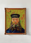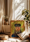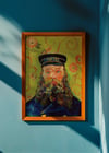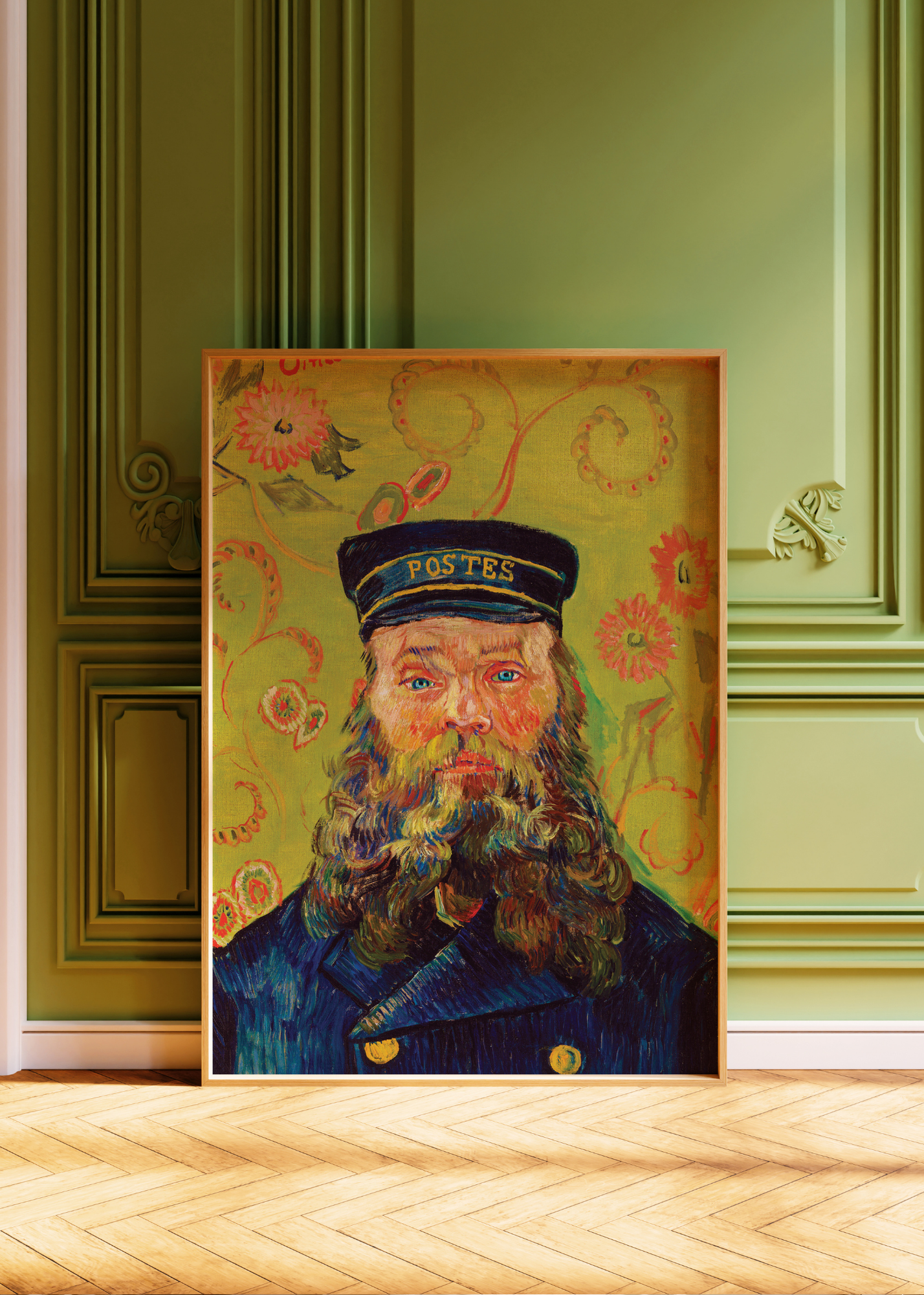 This is a man who carries messages and connections, a bridge between worlds both near and far. His face, lined with experience, holds stories untold—of days spent under open skies, of roads traveled, of human kindness delivered in letters and parcels. The intensity of Van Gogh’s colors and impassioned strokes reveal a soul both grounded and restless, steadfast yet deeply feeling.