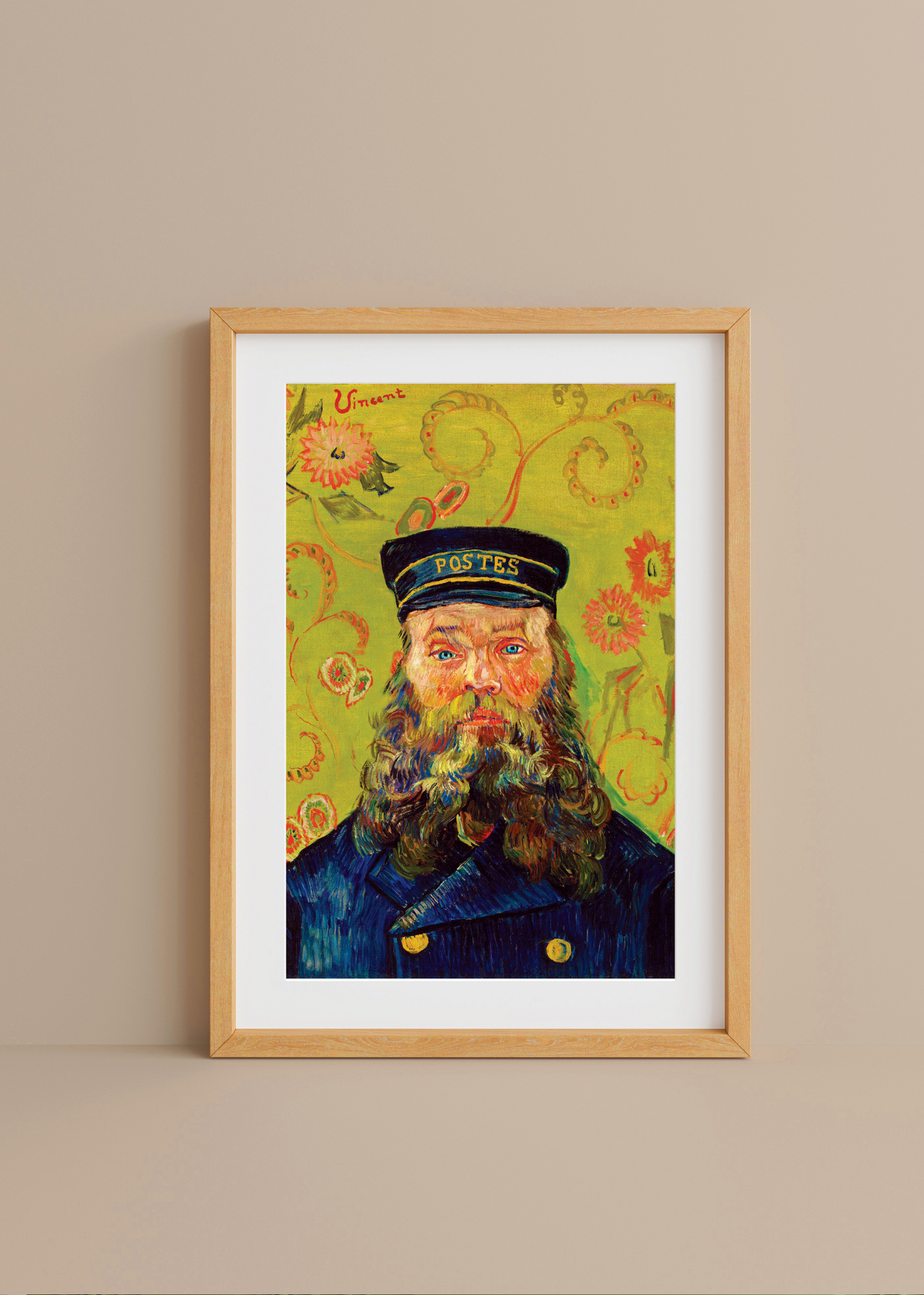 The Postman— In The Postman (Joseph Roulin), Van Gogh paints more than a man — he paints a presence, a steady heartbeat in the rhythm of everyday life. Joseph Roulin, clad in his postal uniform, stands with quiet dignity, his gaze both kind and resolute. The brushstrokes swirl with Van Gogh’s signature energy—vibrant greens, warm ochres, and deep blues converging in a portrait alive with texture and emotion.