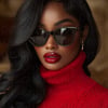 Black Woman Wearing Red Ribbed Turtleneck, Black Sunglasses with Dark Tint and Full Glam Makeup with Red lipstick, Long Wavy Hair, Stock Photo