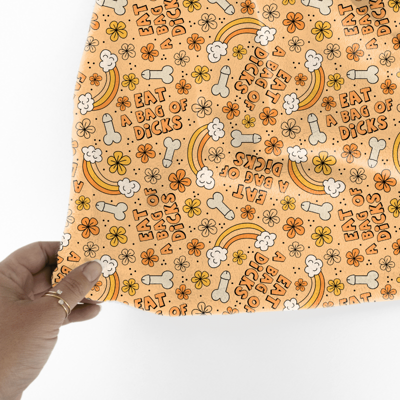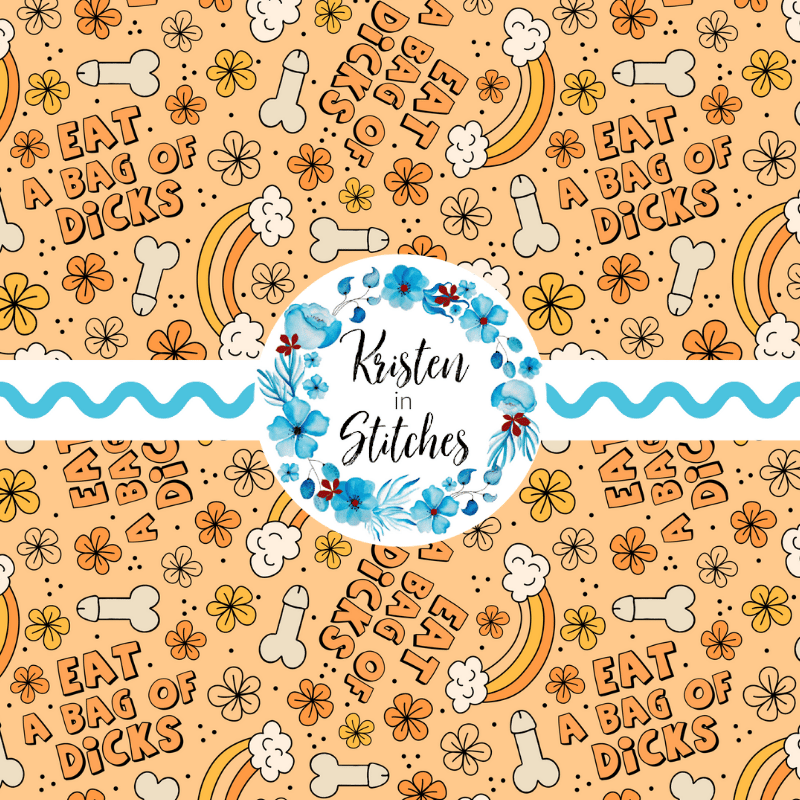 Eat a Bag of Dicks with rainbows and flowers on orange.