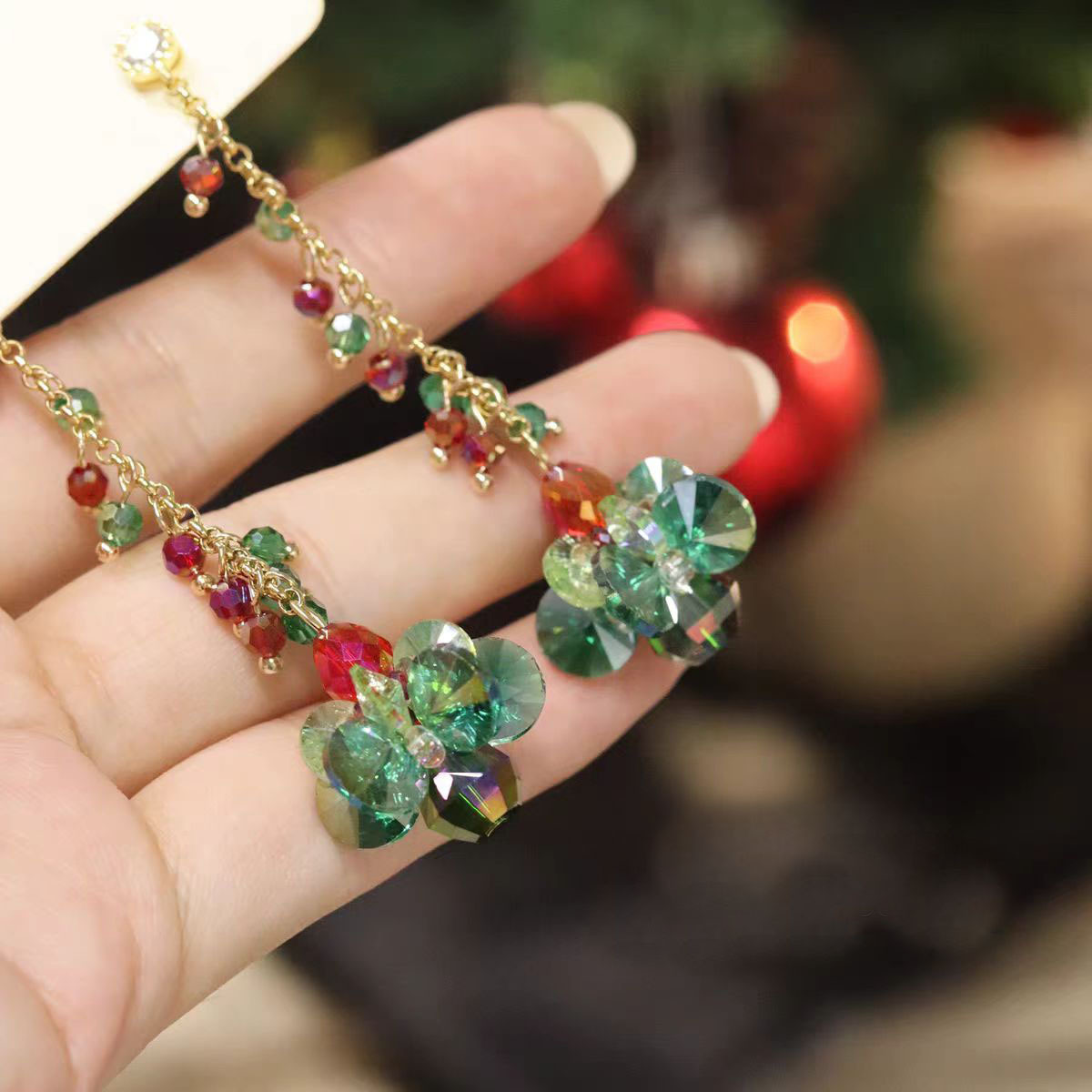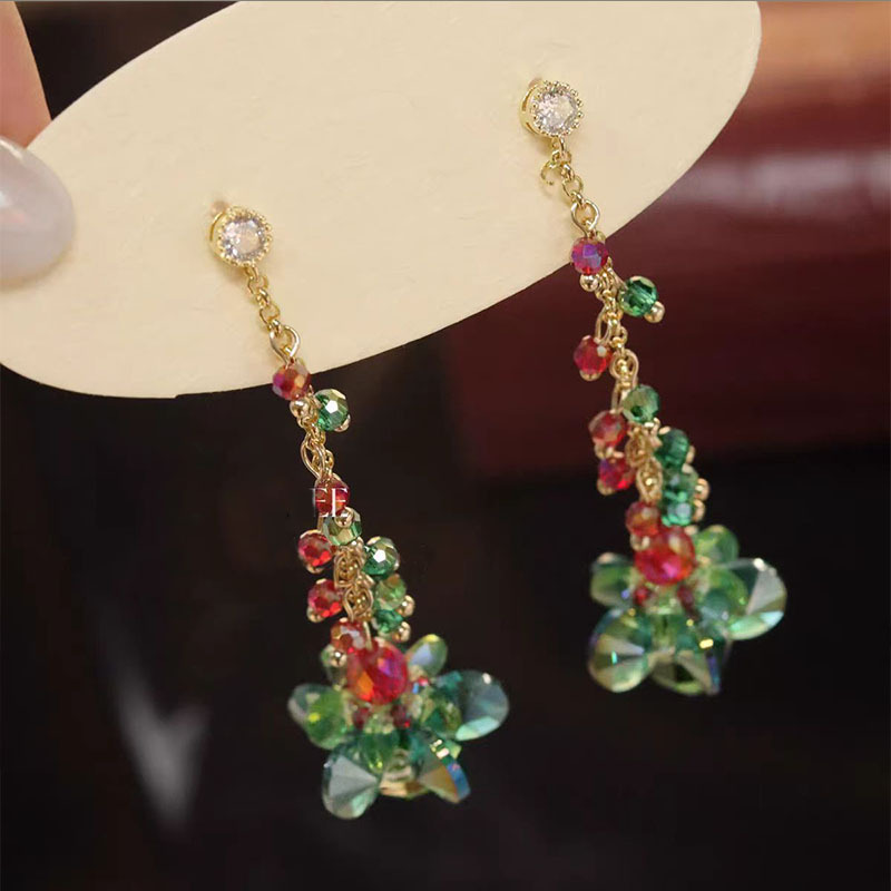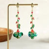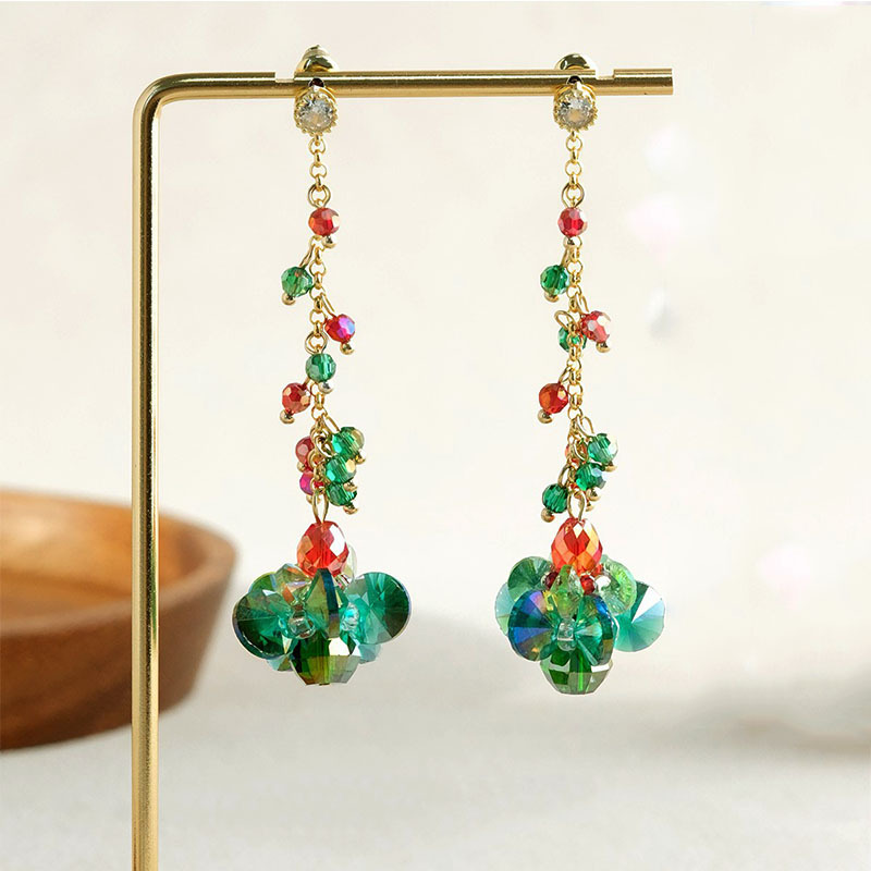 Handmade Christmas tree green crystal beaded long earrings