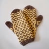 The red/white mittens pictured were knitted with Brown Sheep Nature Spun sport weight yarn in colors red fox and natural. The blue mini-mittens pictured were knitted in Cascade 220 Fingering yarn and size 1 US needles, and the yellow/brown adult sized mittens were knitted in Cascade Baby Alpaca Chunky yarn and size 8 US needles.