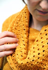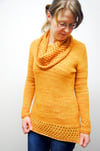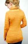 Waist and back shaping give this hip length pullover a figure-flattering hourglass shape. Hem, cuffs, and the cowl are worked in a simple eyelet lace. Worked in luscious single merino this is the go-to fall sweater you’ll grab from your closet again and again.
