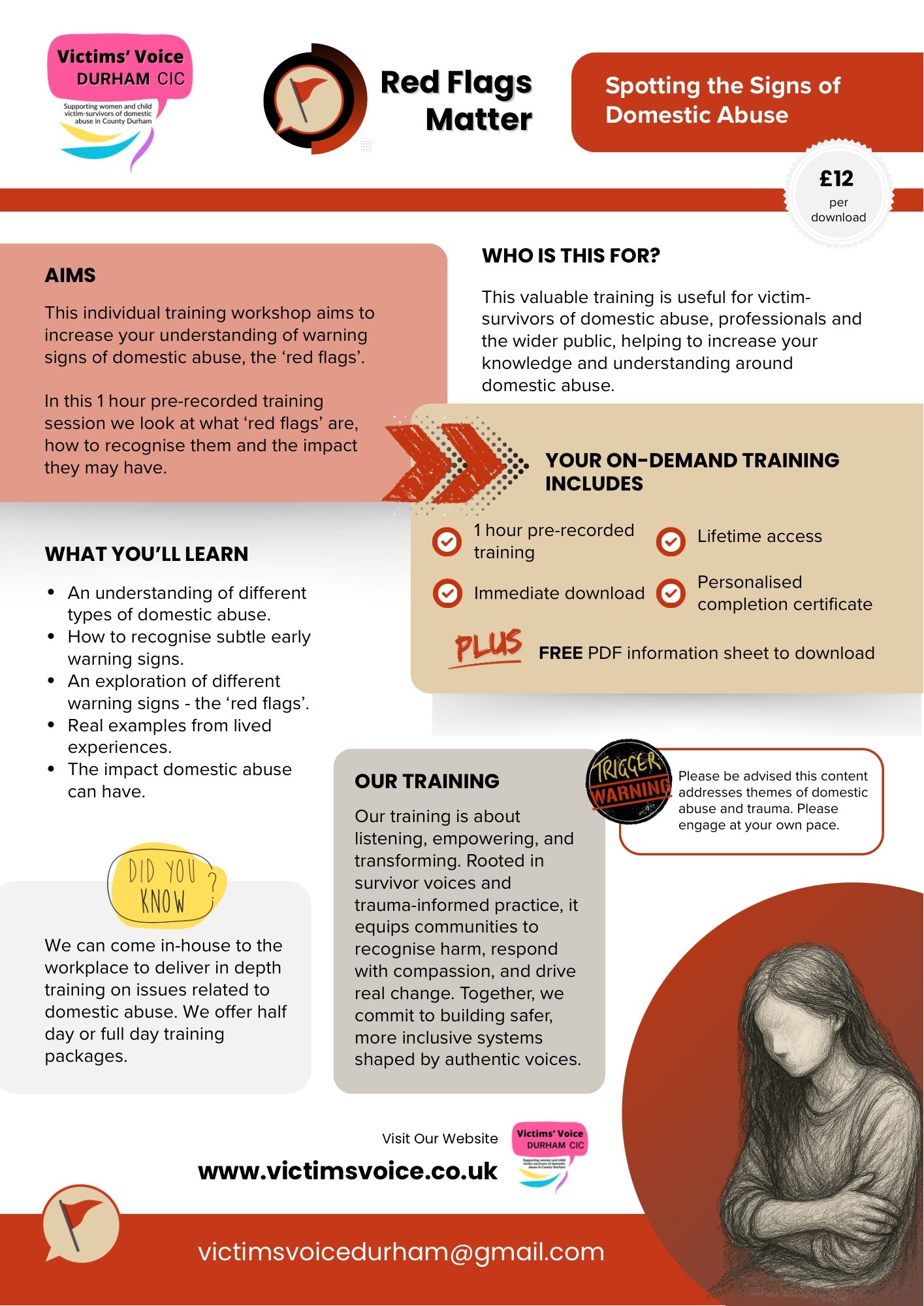 This individual training session aims to increase your understanding of warning signs of domestic abuse, the ‘red flags’.