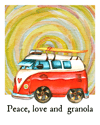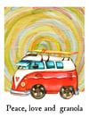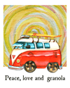 Red hippie bus with yellow retro background and quote, "Peace, love and granola". The watercolor background is in a spiral pattern.