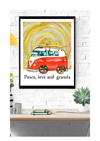 Red Hippie Bus with Yellow Retro Background with Quote "Peace, love and granola"–Beautiful Red Hippie Bus Wall Art-Digital Downloads–Retro Printables-Office Printables–Gift Ideas-Hippie Decor