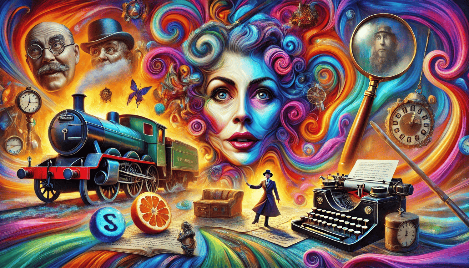 This surreal, high-resolution caricature of Agatha Christie captures the Queen of Mystery in a vibrant and fantastical style. Her expressive features are exaggerated playfully, surrounded by swirling, vivid colors that echo the intrigue and imagination of her iconic detective novels. The background brims with symbolic elements—vintage typewriters, magnifying glasses, mysterious silhouettes, and classic trains—subtly referencing beloved characters like Hercule Poirot and Miss Marple. With a painterly aesthetic and rich detail, this artwork celebrates the timeless legacy of one of literature’s most influential storytellers.