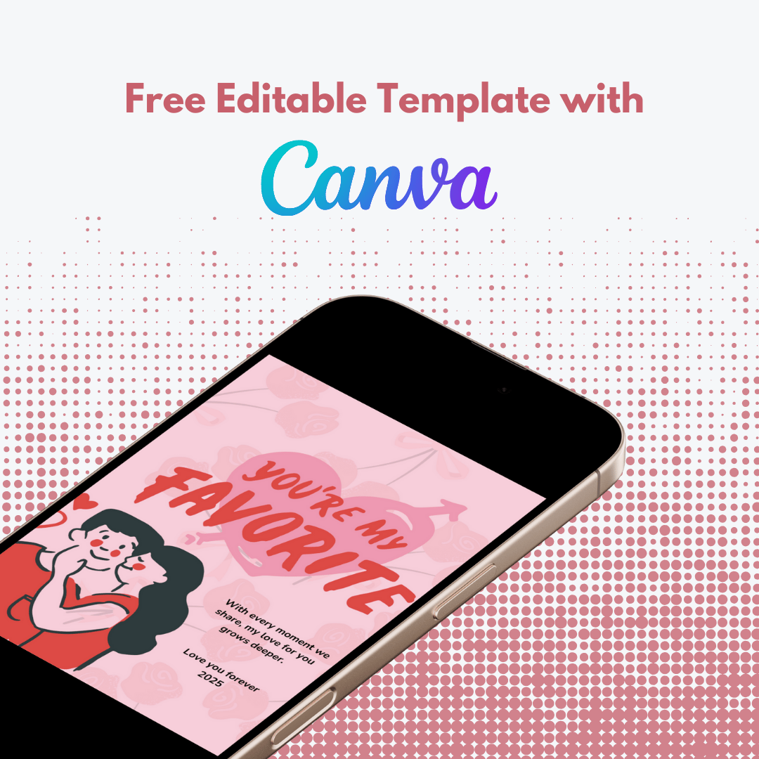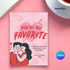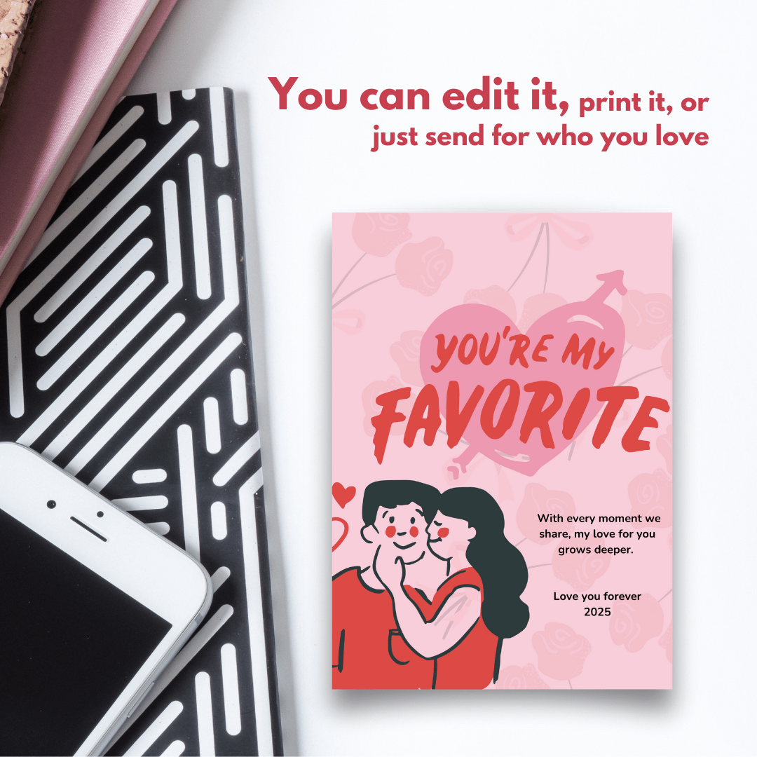 Perfect for February 14th, it features a cute design with a couple, romantic elements like hearts and flowers, and the phrase 'You're My Favorite' in bold letters. The card is easy to edit and can be customized to express your love with a personalized message. Ideal for surprising your favorite person, it’s versatile for sharing as an image, printing, or posting on social media. Use it alongside gifts like chocolate or flowers to make your date extra special. A modern way to express love in the new times.