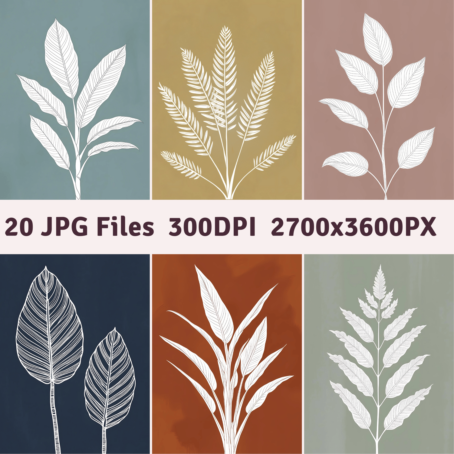 Bring timeless elegance and organic charm into your creative projects with this collection of minimalist botanical line art. Each design features a delicate white one-line illustration of popular plant species — like monstera, eucalyptus, banana leaves, ferns, and more — set against beautifully curated earthy backgrounds in soft terracotta, sage green, mustard yellow, dusty rose, and other warm, muted tones.