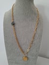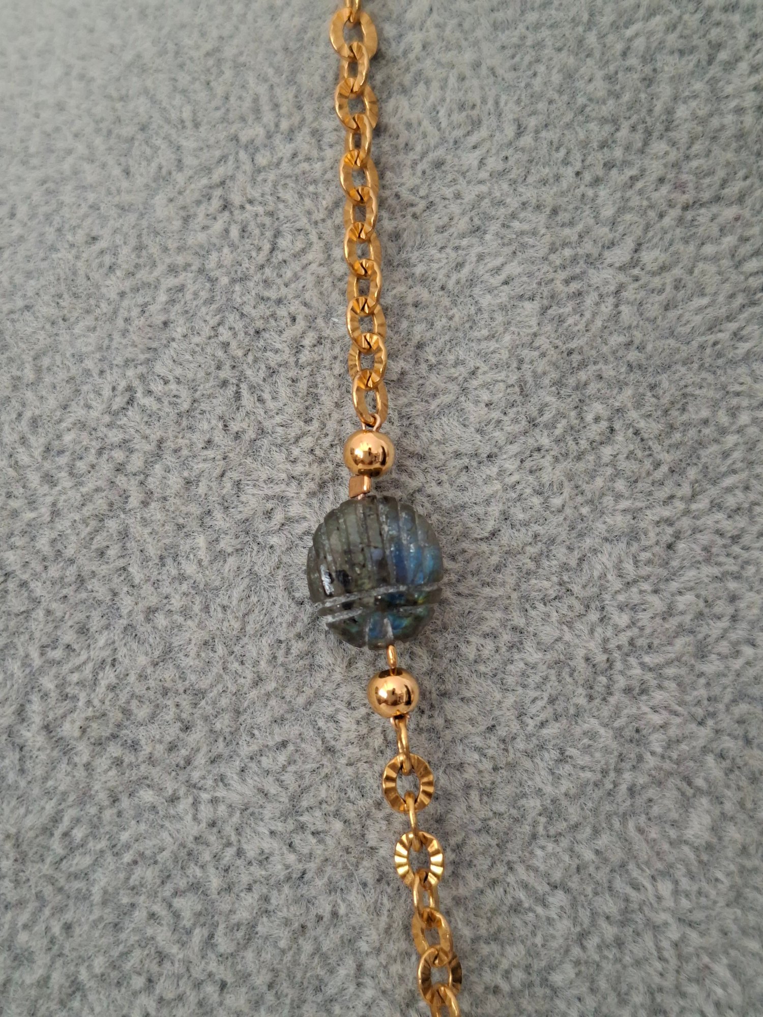 Un collier raffiné et moderne qui joue sur l’asymétrie des maillons et la puissance vibratoire de la labradorite. Sa double chaîne dorée accueille une perle naturelle lumineuse et un pendentif médaille gravé "Bonne Étoile". Un bijou protecteur et élégant, à porter comme un talisman au quotidien.