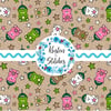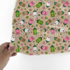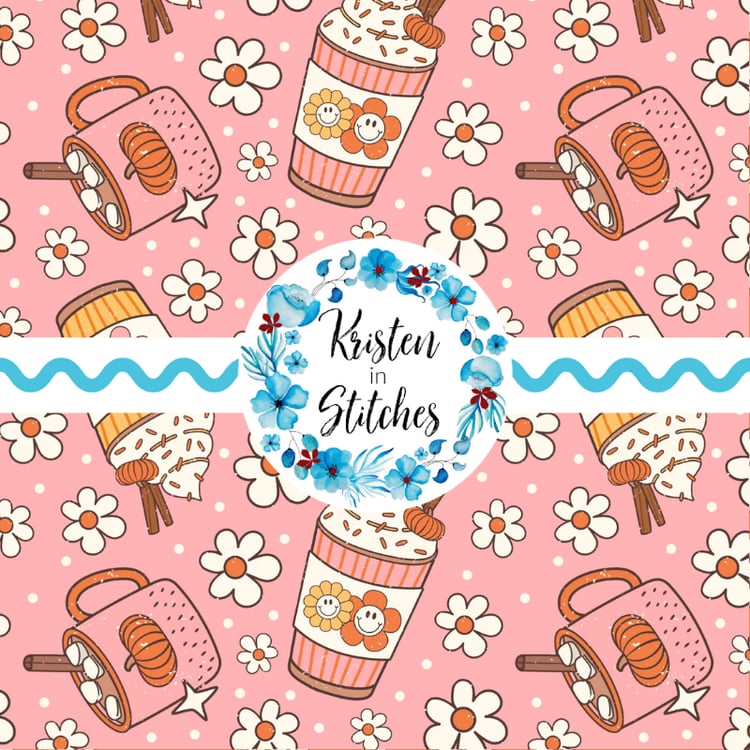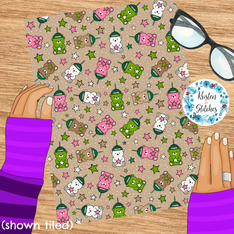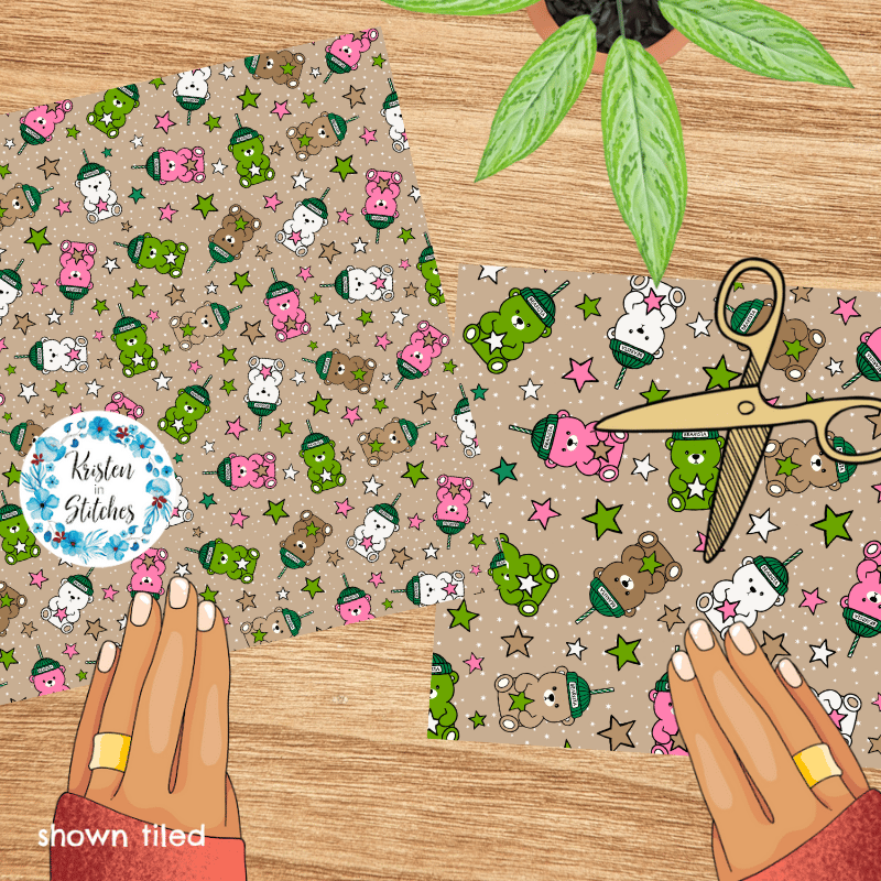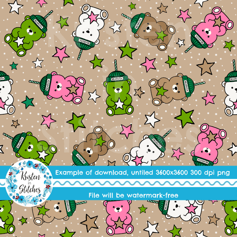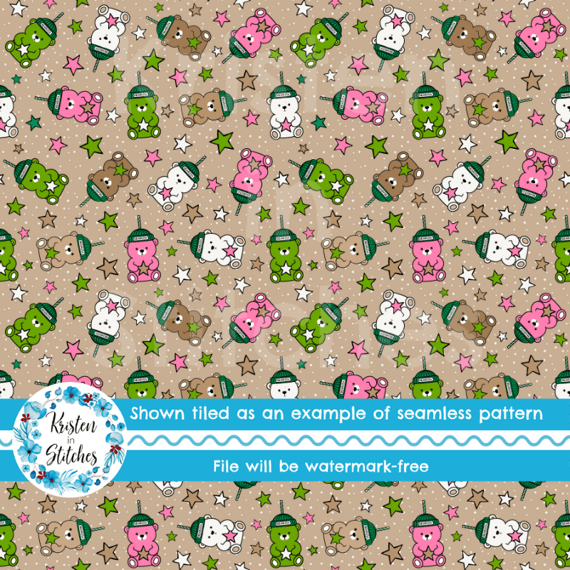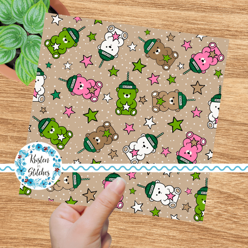 Bearista Beanie Bear Iced Coffee Glass Cups Seamless Pattern, Green Pink White Drinks
