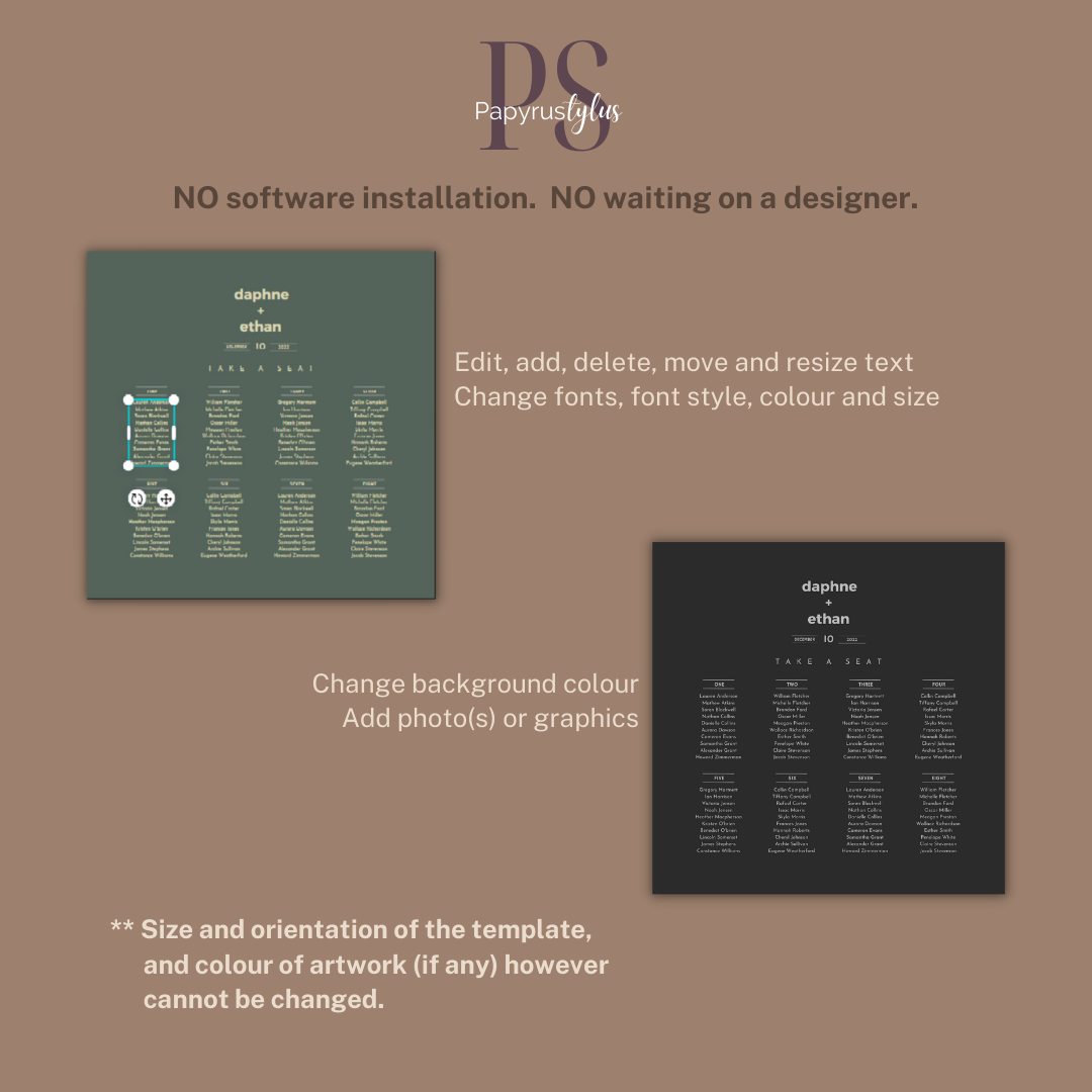Seating chart in unusual square shape, with simple and minimalist layout. The easy-to-customise template comes with two sizes available, you may change the font and colour to better match the theme of your Big Day!