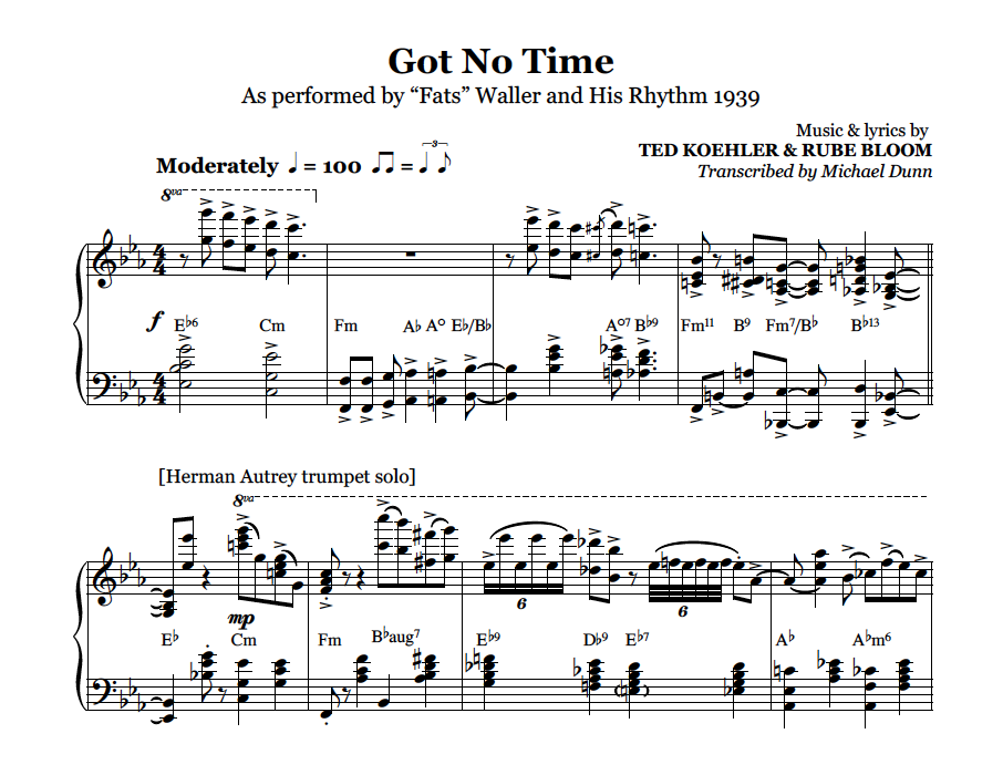 Here's my transcription of Fats performing another great ballad - this time from Koehler and Bloom - called Got No Time, originally from "Cotton Club Parade" of 1932.