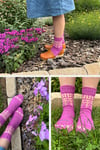 Samples are shown in Size 1 ankle length (green and pink) using Green Letter Day Sock (473 yds [430m] / 100g; 75% SW Merino / 25% nylon) in Locksley (MC yarn) and All the Way Mae (CC yarn) and Size 2 calf length (purple and pink) using Green Letter Day Sock in Megara (MC yarn) and Beach Read (CC yarn).