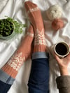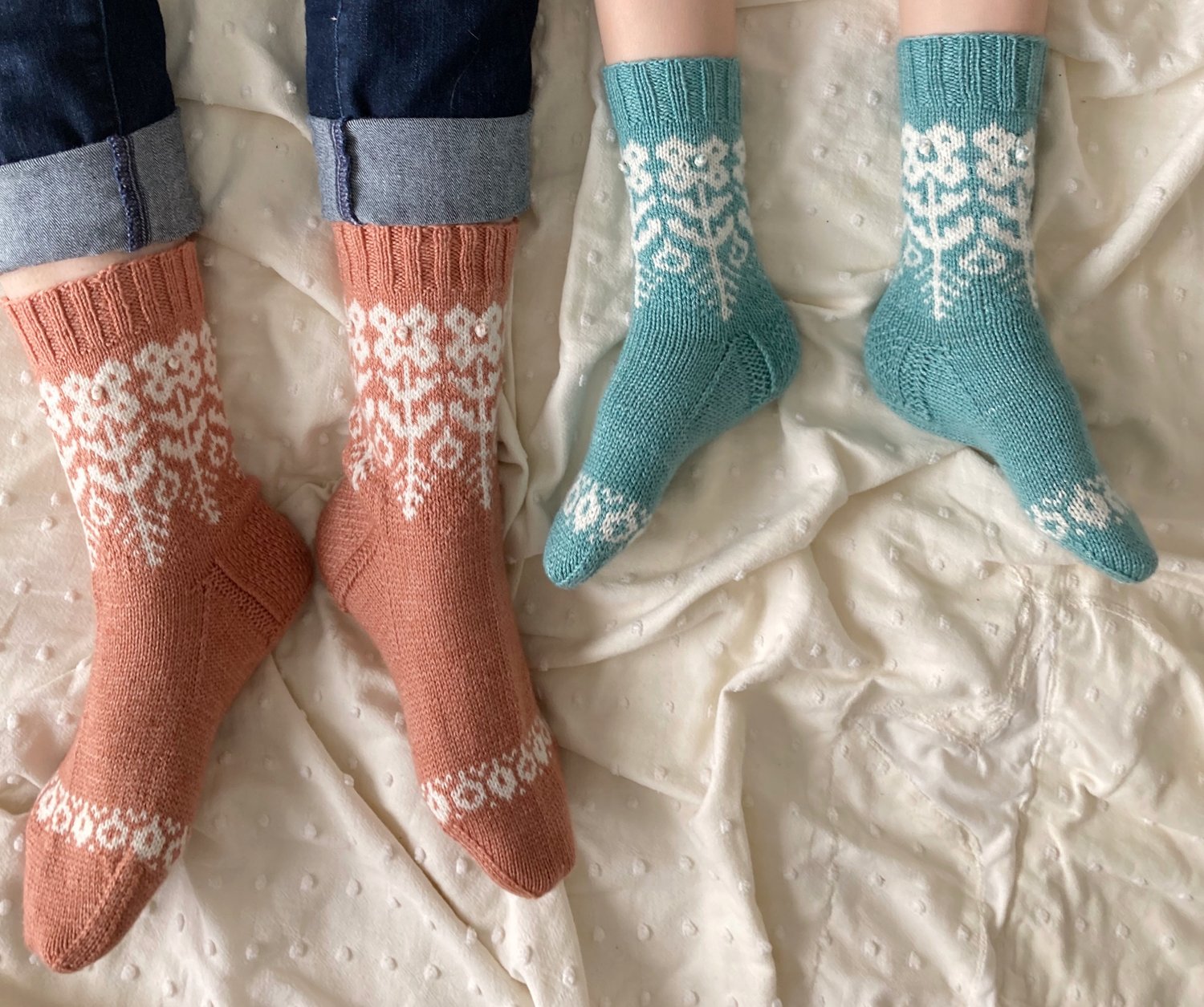 Note: The Flower Gathering Socks pattern is now available as a pdf pattern! The download includes both the original magazine version and a new edition. The original and new edition have different gauge and sizing, as well as different yardage requirements (see notes below). The original version features larger colorwork motifs, and the new edition has smaller motifs and includes instructions for ankle- and calf-length versions.