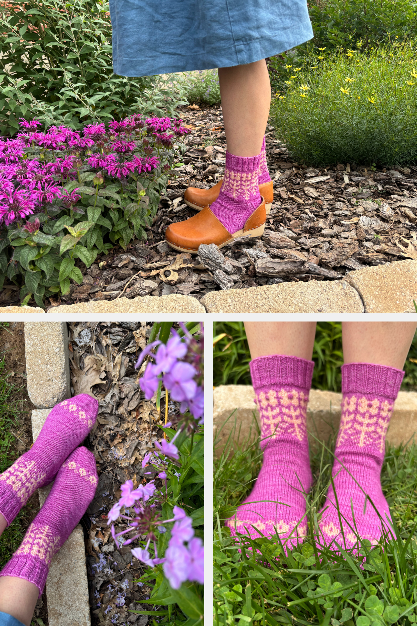 To prolong the enjoyment of seasonal flowers, I designed these socks that celebrate the beauty of the entire growing process: the seeds, rain, roots, and blooms. Flower Gathering Socks capture the joy of carrying home a carnation, dreaming of what seeds to plant each spring, seeing peonies bud after a drenching rain, and cutting candy-colored zinnias in the summer heat. This top-down sock pattern features botanical colorwork and heel-flap-and-gusset construction. To keep the knitting interesting, it includes an “eye of partridge” heel flap with garter stitch edges, a half-handkerchief heel, and bobble centers for the flowers.