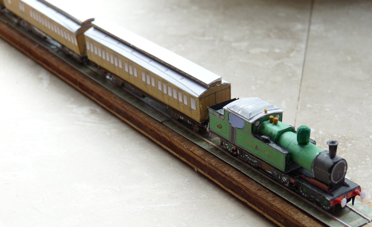 This is a 2014 designed card kit with later updates to cut out and assemble which builds to a complete passenger train measuring approximately 11” long with included track base. Comprising 9K class Robinson 4-4-2T locomotive (LNER C13 class), a pair of clerestory non-corridor coaches, a horsebox and track base. This model represents a typical short passenger train circa 1905.