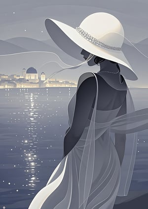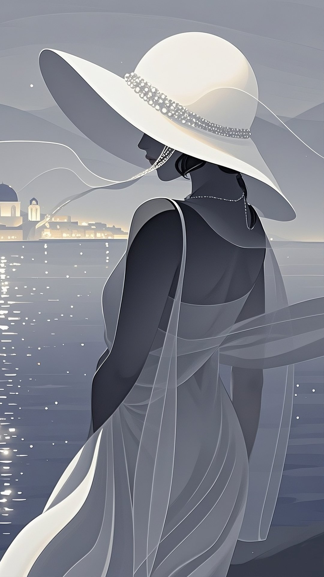 The city lights in the background reflect off the ocean surface, creating a magical atmosphere and balancing the entire screen. The composition of the woman from behind looking at the sea and the city encourages the viewer to imagine what she is thinking, and gives a sense of quiet storytelling. Symbolic motifs of elegance, such as large hats, pearl accessories and flowing cloth, are beautifully arranged, creating an air that feels as if time has stopped.