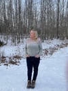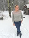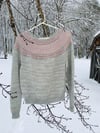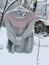 Winterlicious is worked in one piece, in the round, from the top down. The EOR marker is placed at the back centre. Commencing with a garter and brioche yoke, then some short rows are worked to the back of the sweater before finishing the yoke to the sleeve and body separation. The body is then worked to the hem. Finally, the sleeves are worked from the top down.