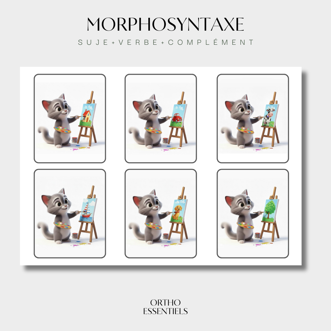 Ce fichier comprend 10 séquences de 6 images, permettant de travailler la construction de phrases simples de type sujet + verbe + complément.