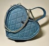 This heart-shaped handbag is a medium size (9”x8.5”x3”) made from upcycled denim. The panels have been quilted and padded. It stands on its own. The front is accented with rhinestones on each of the quilted diamond points. It has an iridescent zipper with dual heart pulls.