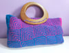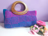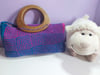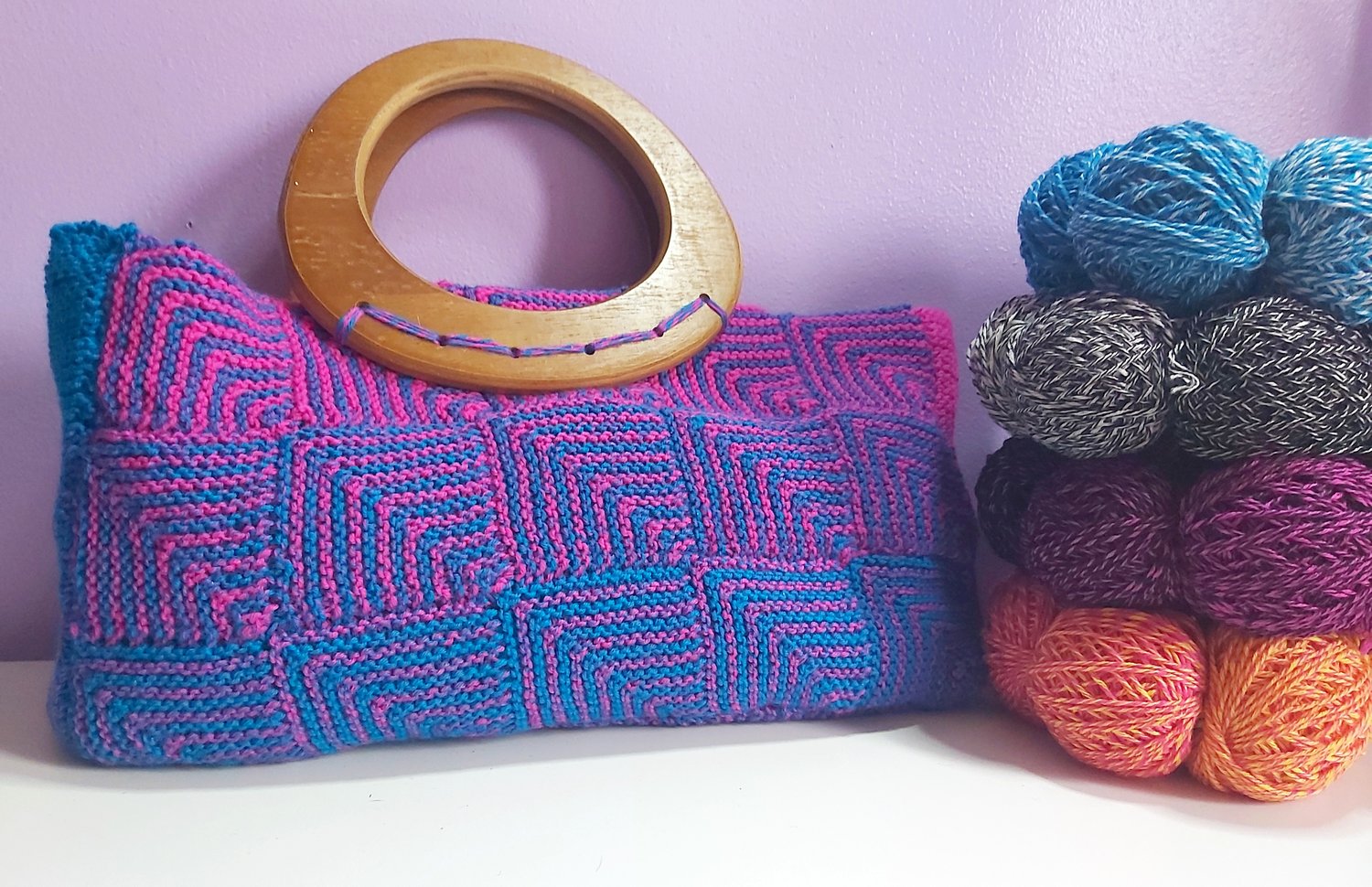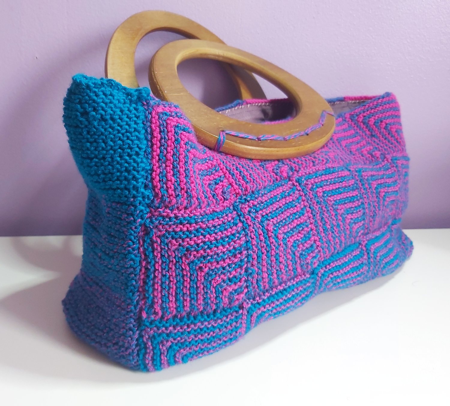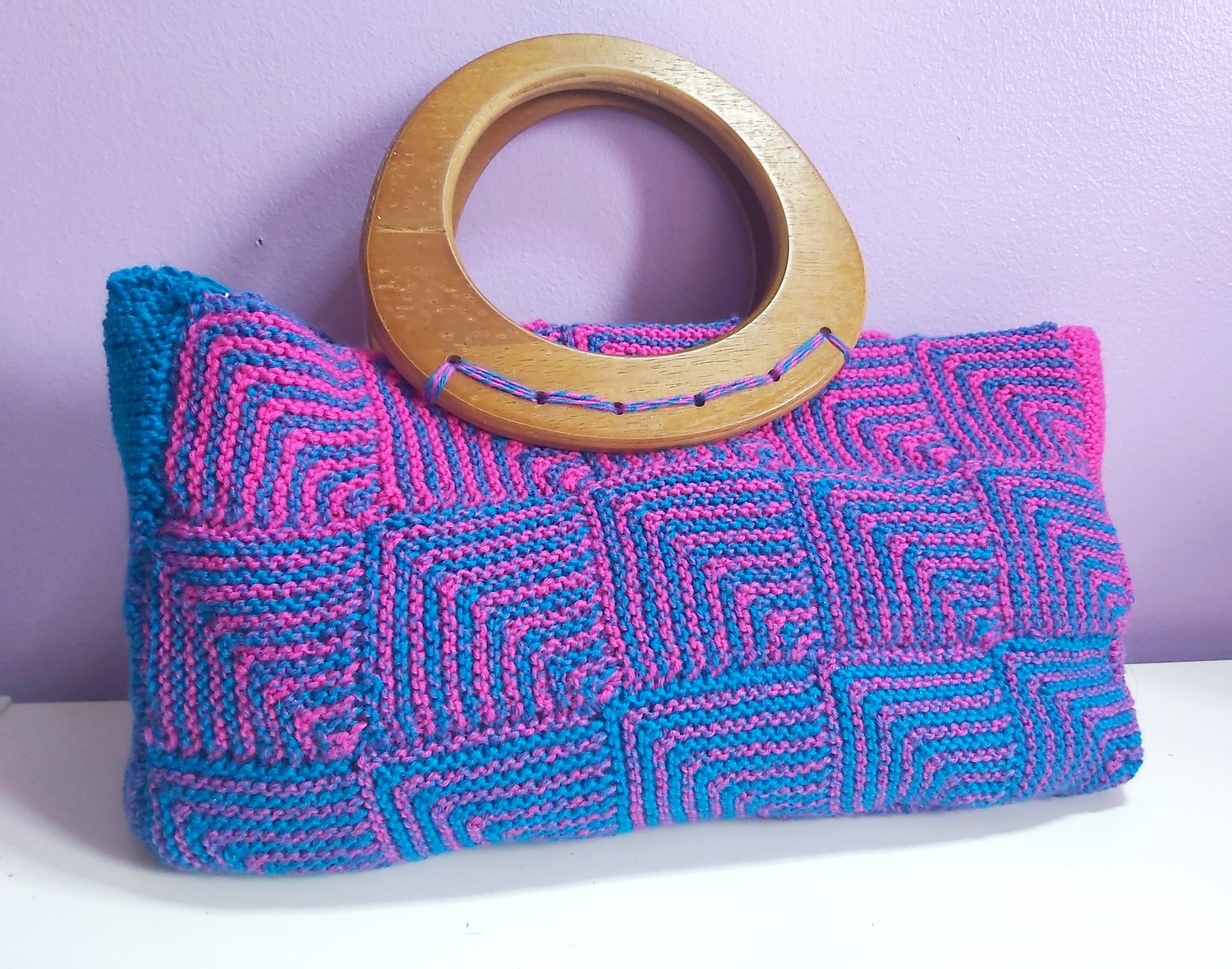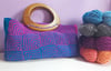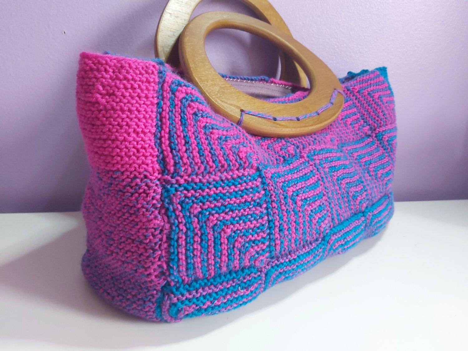 This stylish bag is created by working mitred squares and has oval wooden handles (alternative handles can be used). The mitred squares are joined as you work; and the bag can be made smaller or larger by working fewer or more squares.