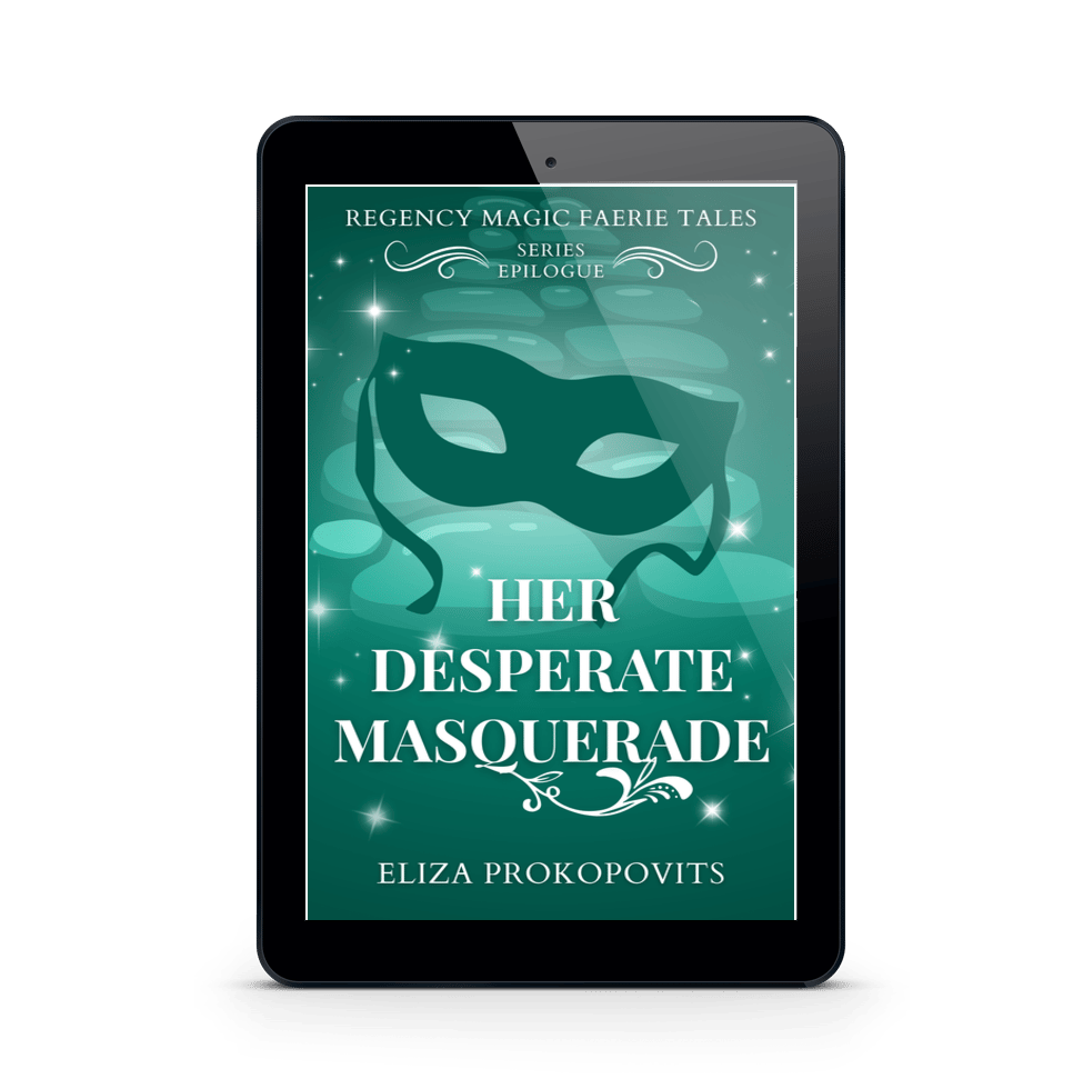 Her Desperate Masquerade is a short standalone novella with a complete HEA that can be enjoyed without reading the rest of the Regency Magic Faerie Tales. It also serves as a series epilogue, so it contains cameos from the main characters of the other books.