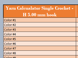 This listing is for the yarn calculator in excel file format only. This calculator is designed to assist you determining the amount of yarn you will need to complete a project. It is designed using worsted weight #4 yarn, the hook size listed on each tab, and the average calculation of a subject group. Your results may vary based on hook size, yarn type, and tension. In order to assist you with customizing your needs there is a custom calculator which will allow you to enter your own information. This calculator covers Single Crochet, Extended Single Crochet, Half Double Crochet, Mini C2C, C2C, Bobble Stitch (5DC tog), as well as Tunisian Simple Stich.
