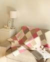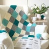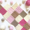 - The blanket is knit as several vertical stripes of squares that are later sewn together, which makes it easy to carry your project around.