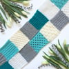 - Individual squares are knit using various combinations of knit and purl stitches, and a simple 2-stitch cable pattern.