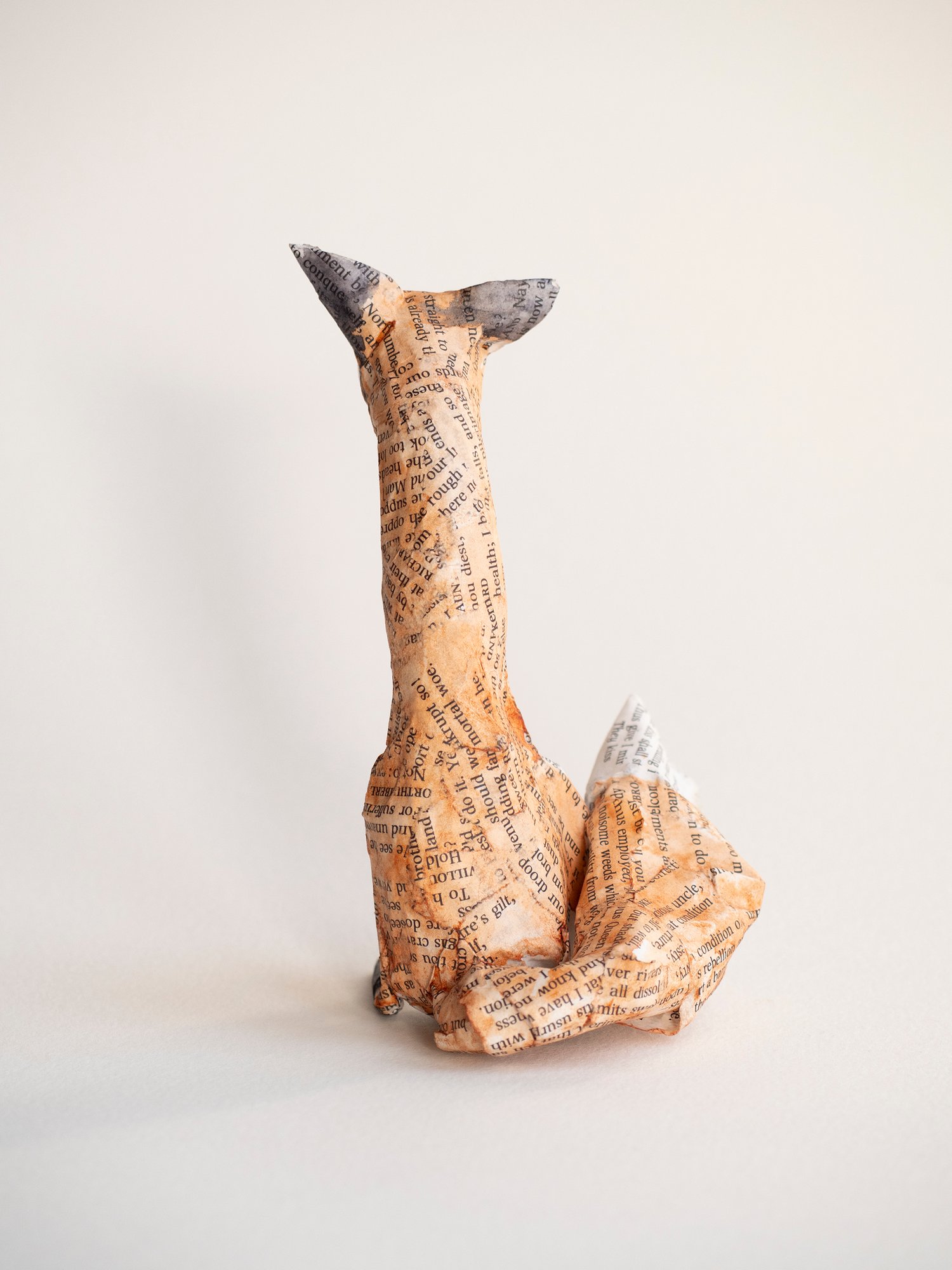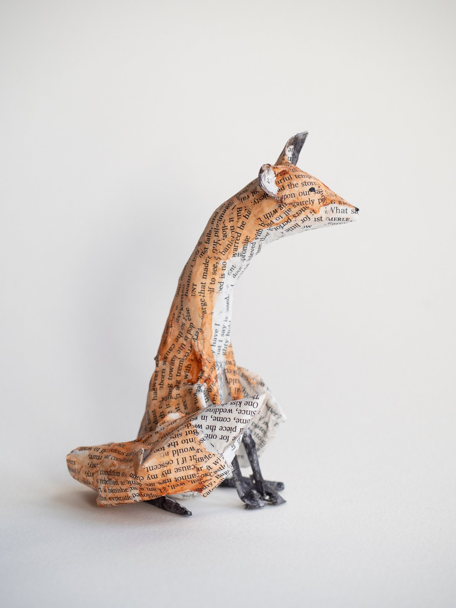 A handmade paper mache folk art sculpture of a sitting fox. It is created from paper mache using book paper, wire and watercolour and is approx 12cm high. Made with newspaper, wire, glue, pages from Shakespeare, and watercolour paint.