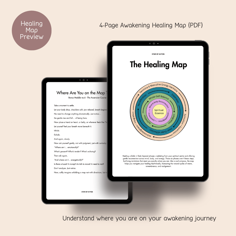 A beautifully designed, multi‑page guide taken from Module 6 of the Ascension Course. This isn’t just a single visual, it’s a mini framework that helps you understand where you are in your awakening process and how to support yourself through each phase.