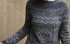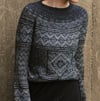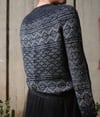 Nightbook is a yoked sweater that is constructed top-down, with short row shaping incorporated to optimise fit. It is intended to be worn with 4-8” of positive ease, making it a comfortable, enveloping sweater with a striking design.