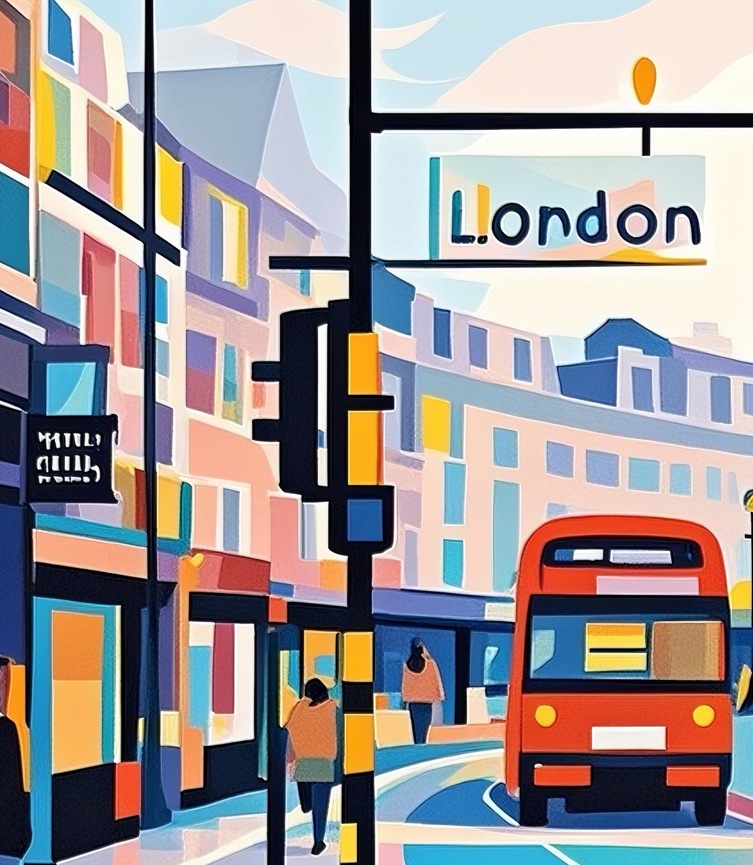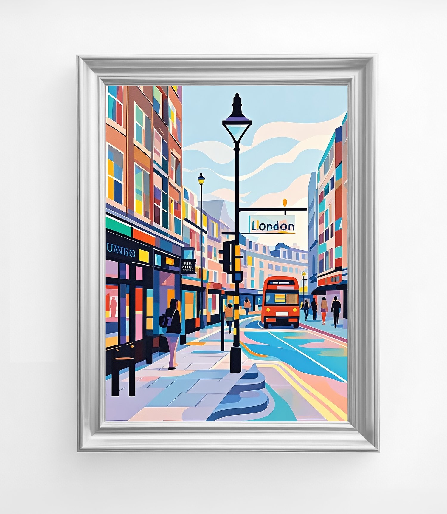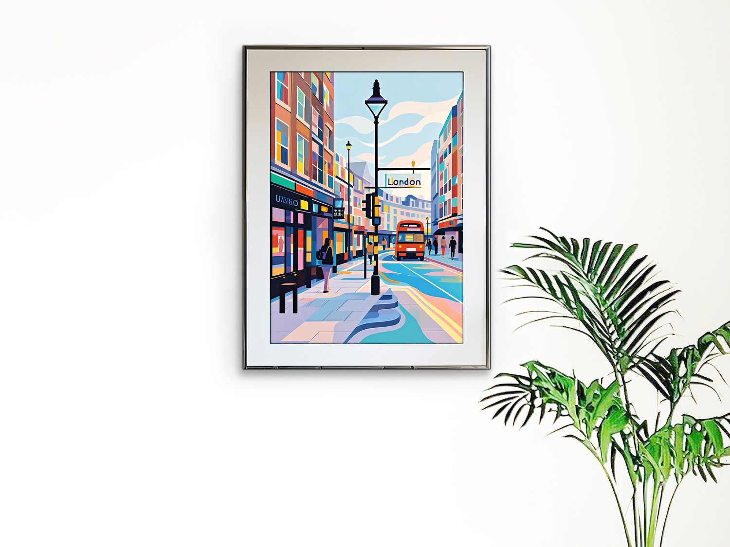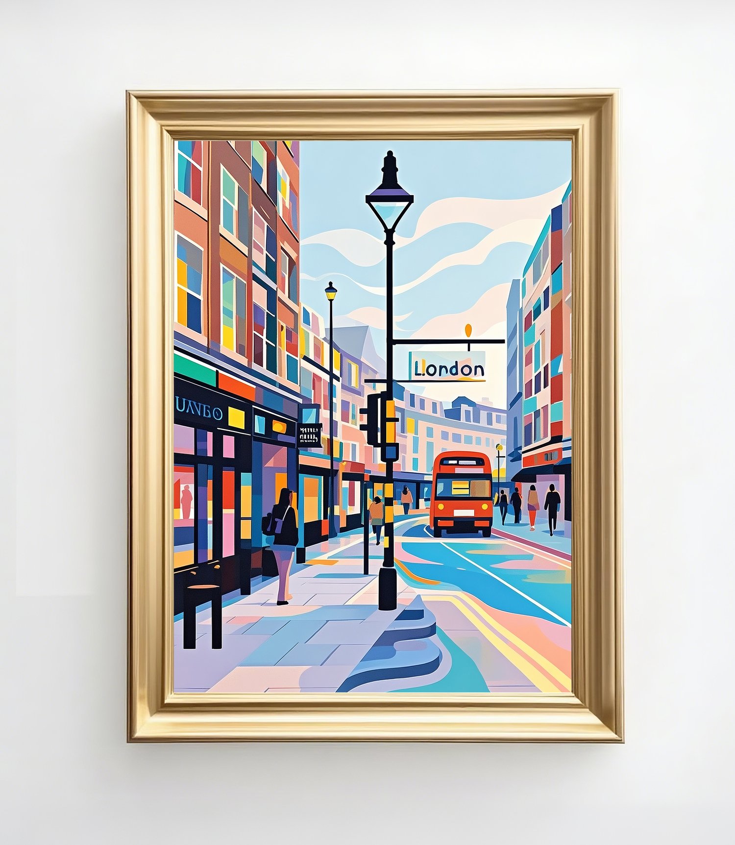 This artwork presents a vibrant and modern interpretation of London’s cityscape, rendered in a pop-art inspired, geometric style. The use of bold, flat color blocks across buildings, windows, and the pavement creates a strong visual rhythm, while the iconic red double-decker bus anchors the scene with cultural identity. The flowing curves in the sky and on the street add a sense of energy and movement, symbolizing the lively pulse of the city. By simplifying forms into clean lines and vivid hues, the piece transforms everyday urban scenery into a dynamic, uplifting visual experience. The iconic “London” sign, lampposts, and pedestrians further emphasize the blend of realism and abstraction, making this artwork highly effective as both decorative art and a contemporary representation of urban life.