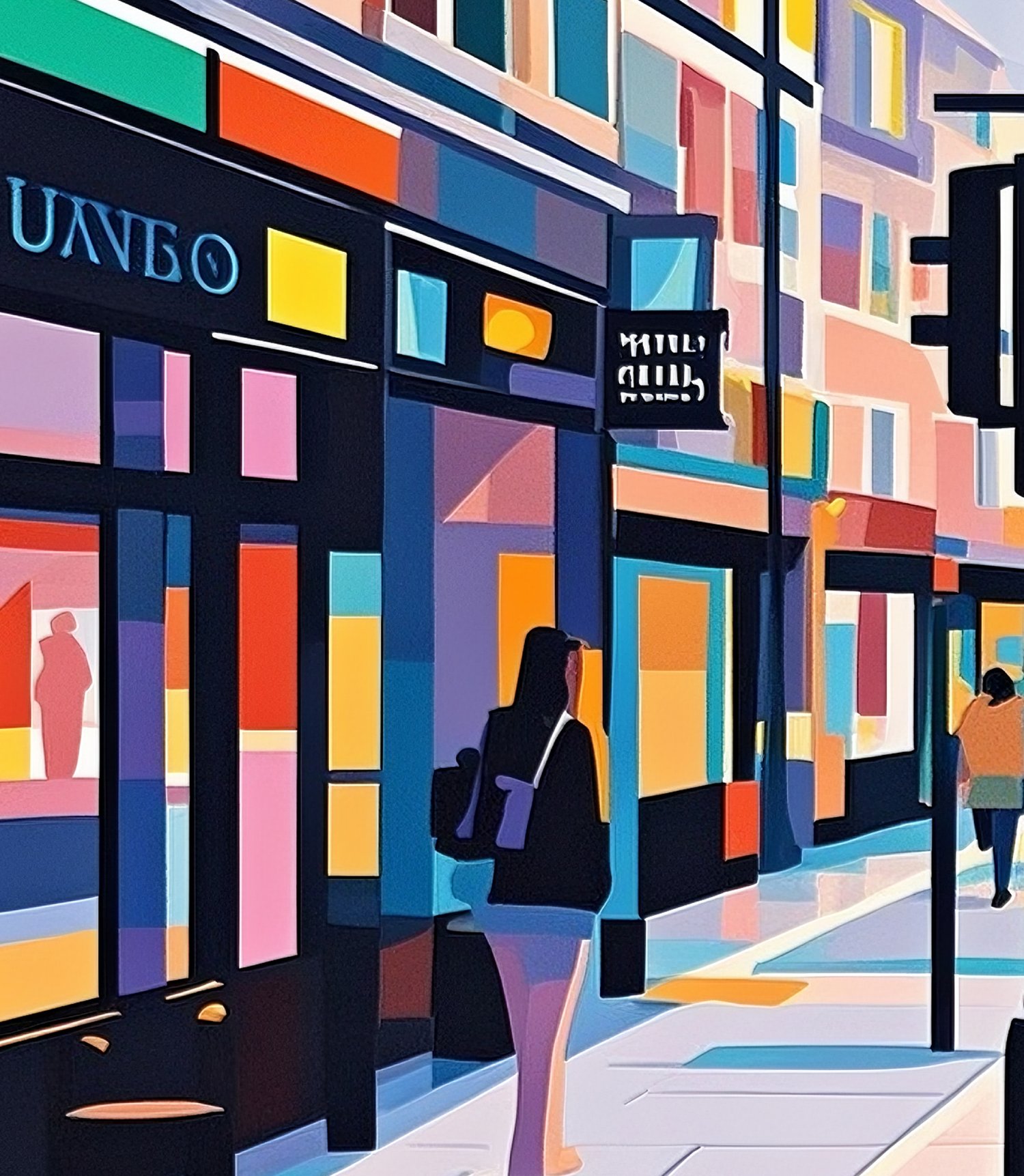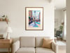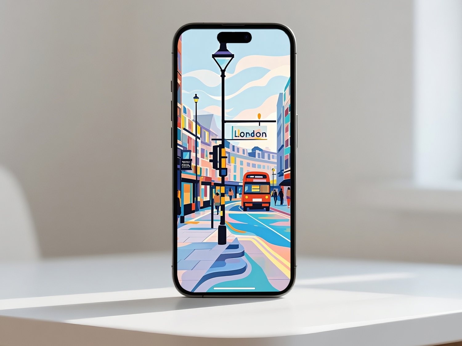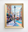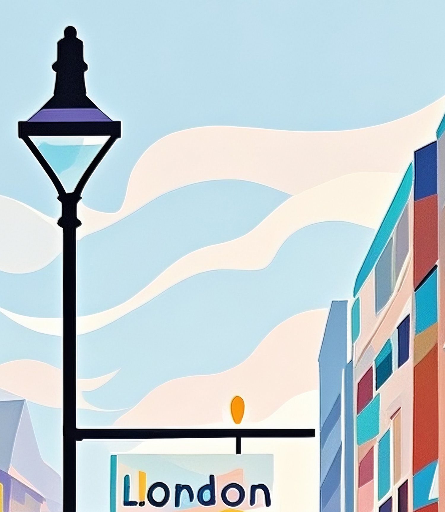 This artwork presents a vibrant and modern interpretation of London’s cityscape, rendered in a pop-art inspired, geometric style. The use of bold, flat color blocks across buildings, windows, and the pavement creates a strong visual rhythm, while the iconic red double-decker bus anchors the scene with cultural identity. The flowing curves in the sky and on the street add a sense of energy and movement, symbolizing the lively pulse of the city. By simplifying forms into clean lines and vivid hues, the piece transforms everyday urban scenery into a dynamic, uplifting visual experience. The iconic “London” sign, lampposts, and pedestrians further emphasize the blend of realism and abstraction, making this artwork highly effective as both decorative art and a contemporary representation of urban life.
