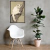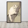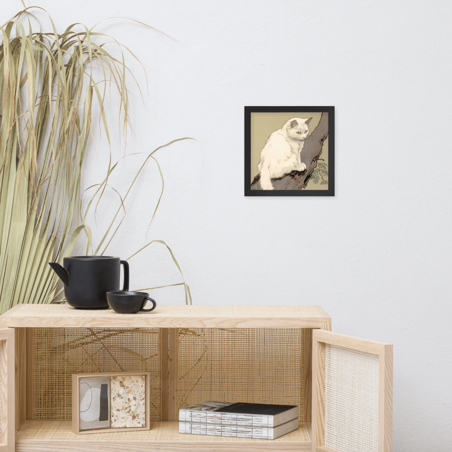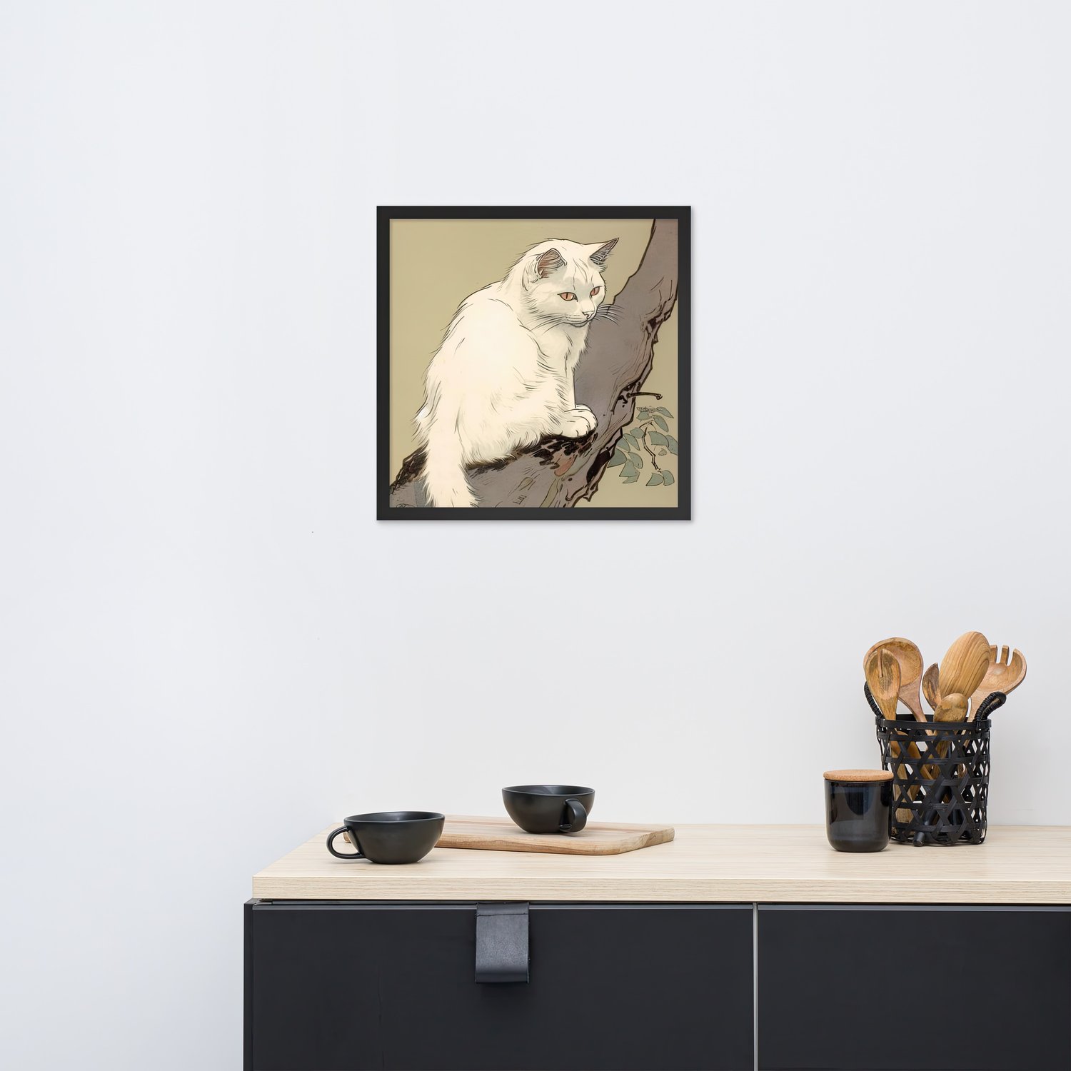 Bring a touch of elegance and tranquility to your home with this beautiful white cat sitting on a branch, captured in delicate Japanese fine line drawing style.
