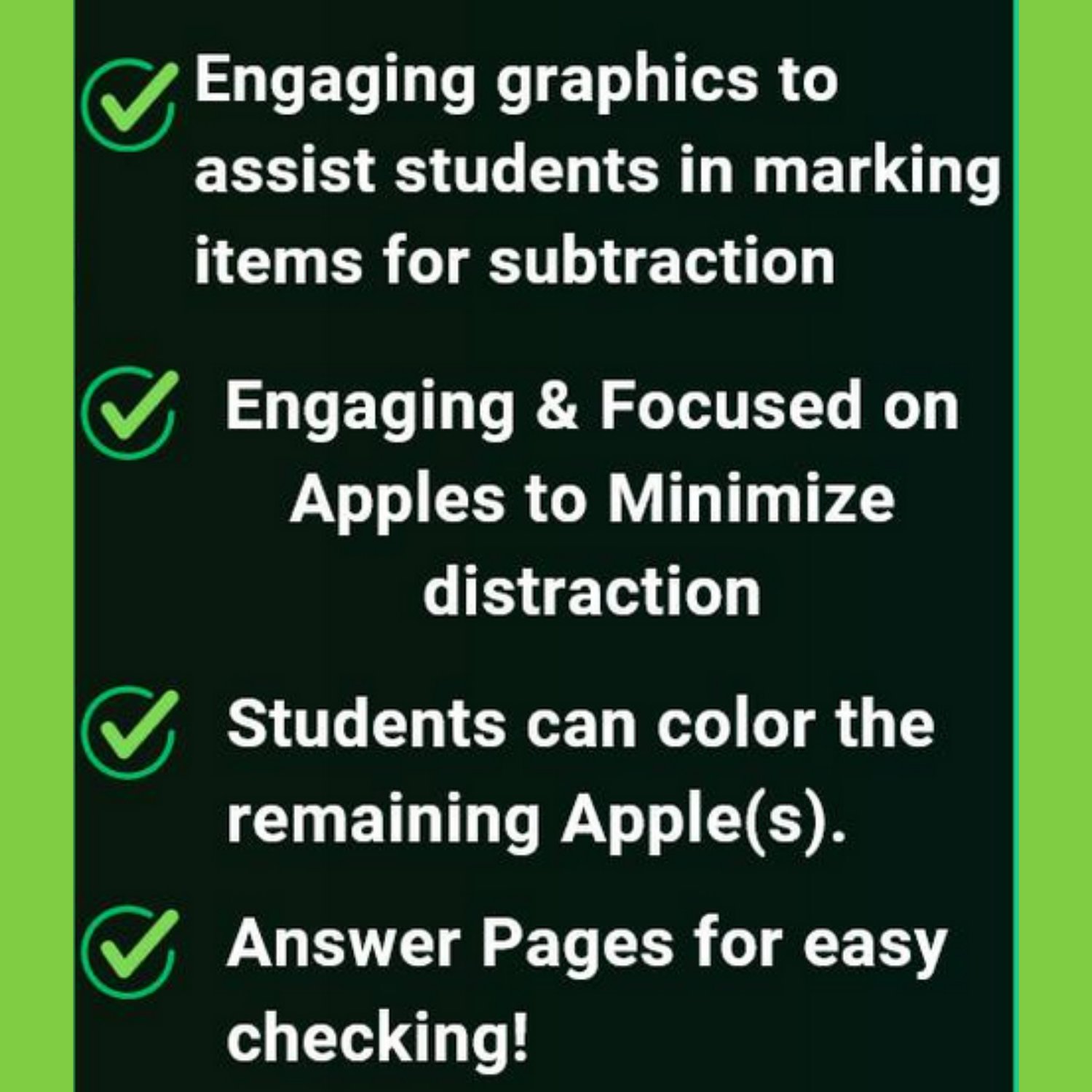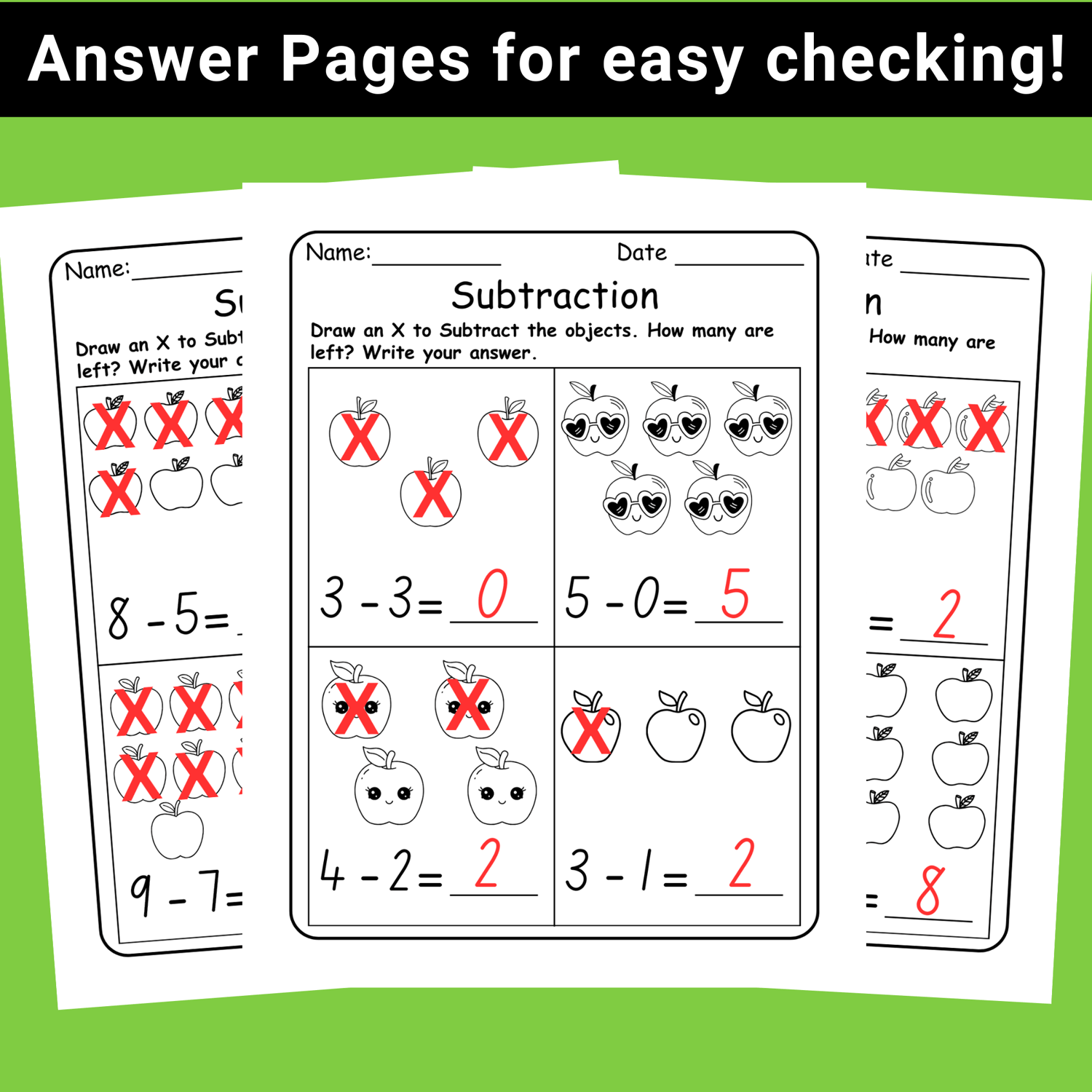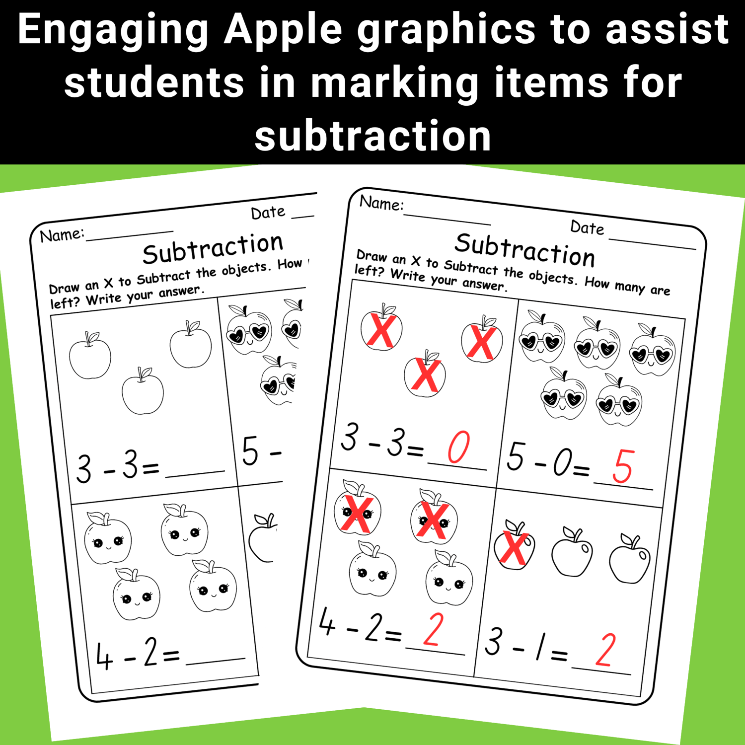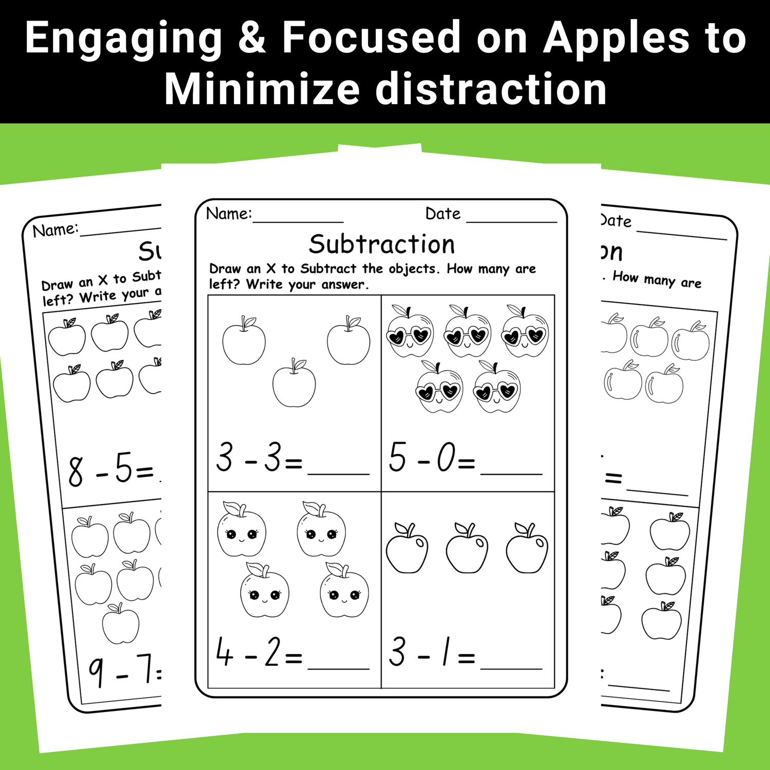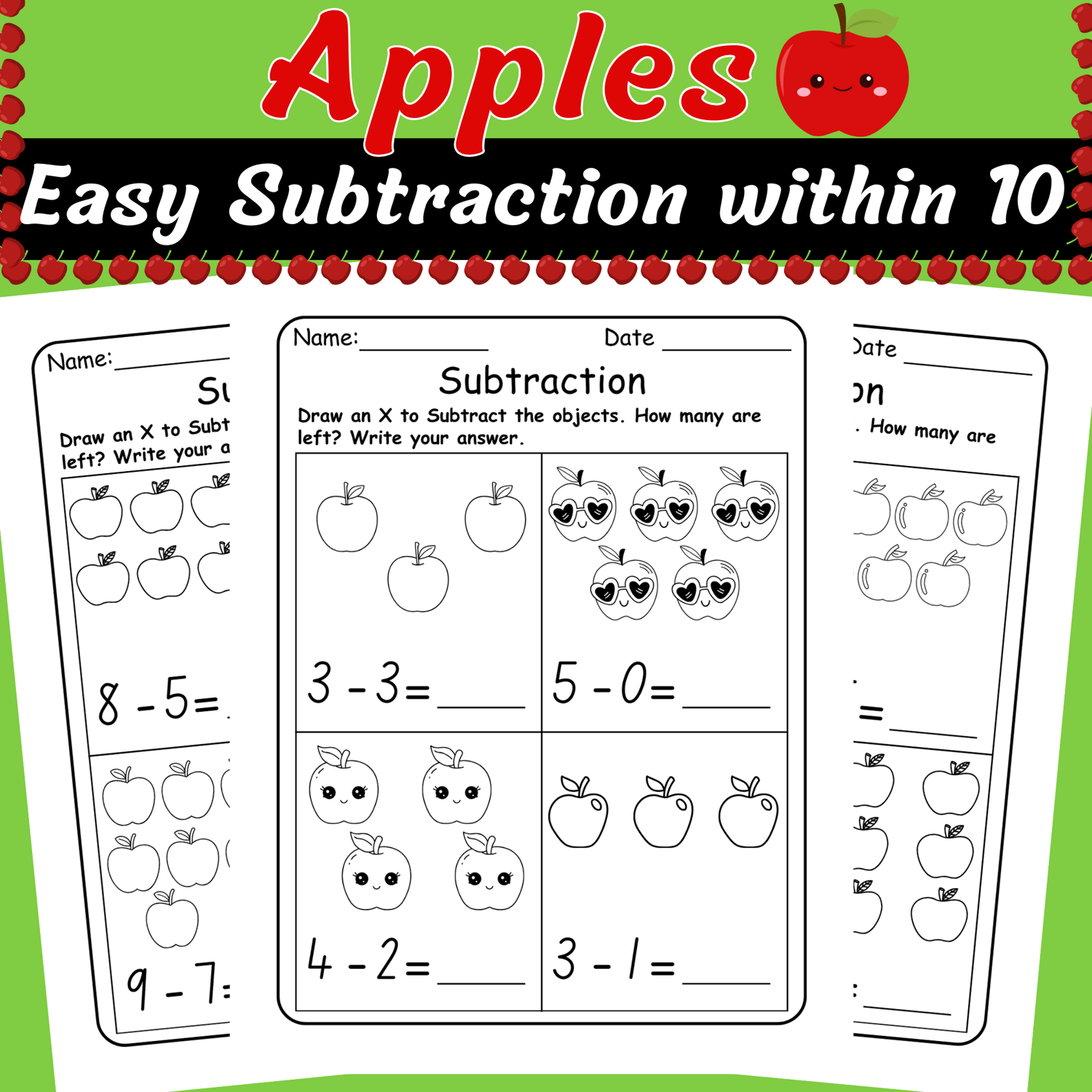 Each worksheet features apple-themed graphics and provides four subtraction problems per page, helping children practice subtracting numbers from 1 to 10. These worksheets encourage problem-solving, fine motor development, and math confidence through hands-on, visually guided activities.