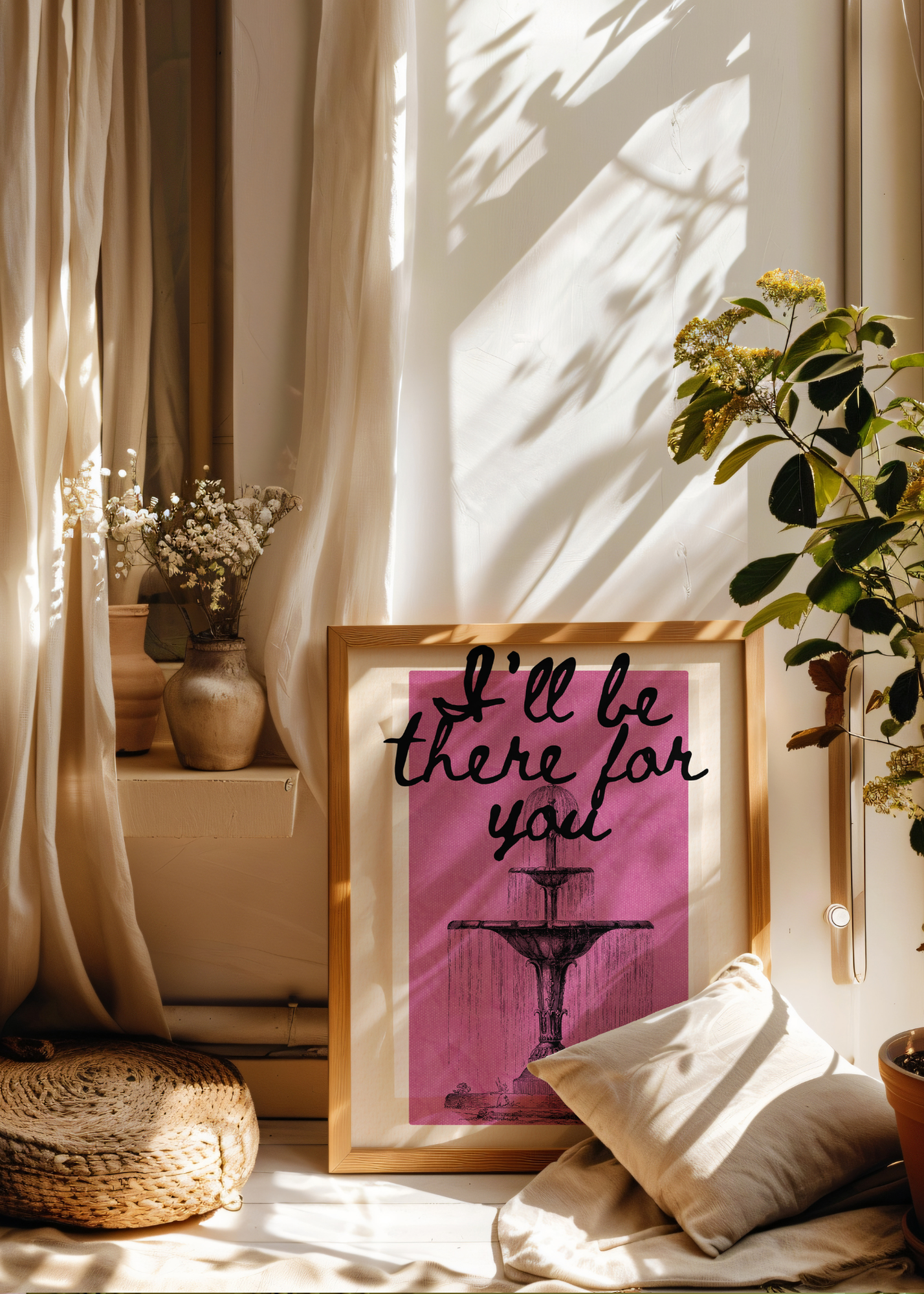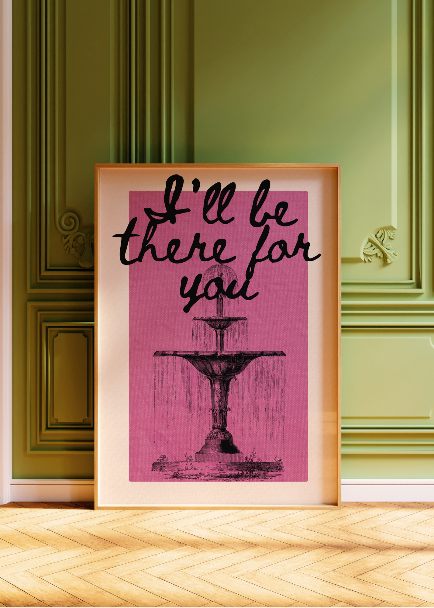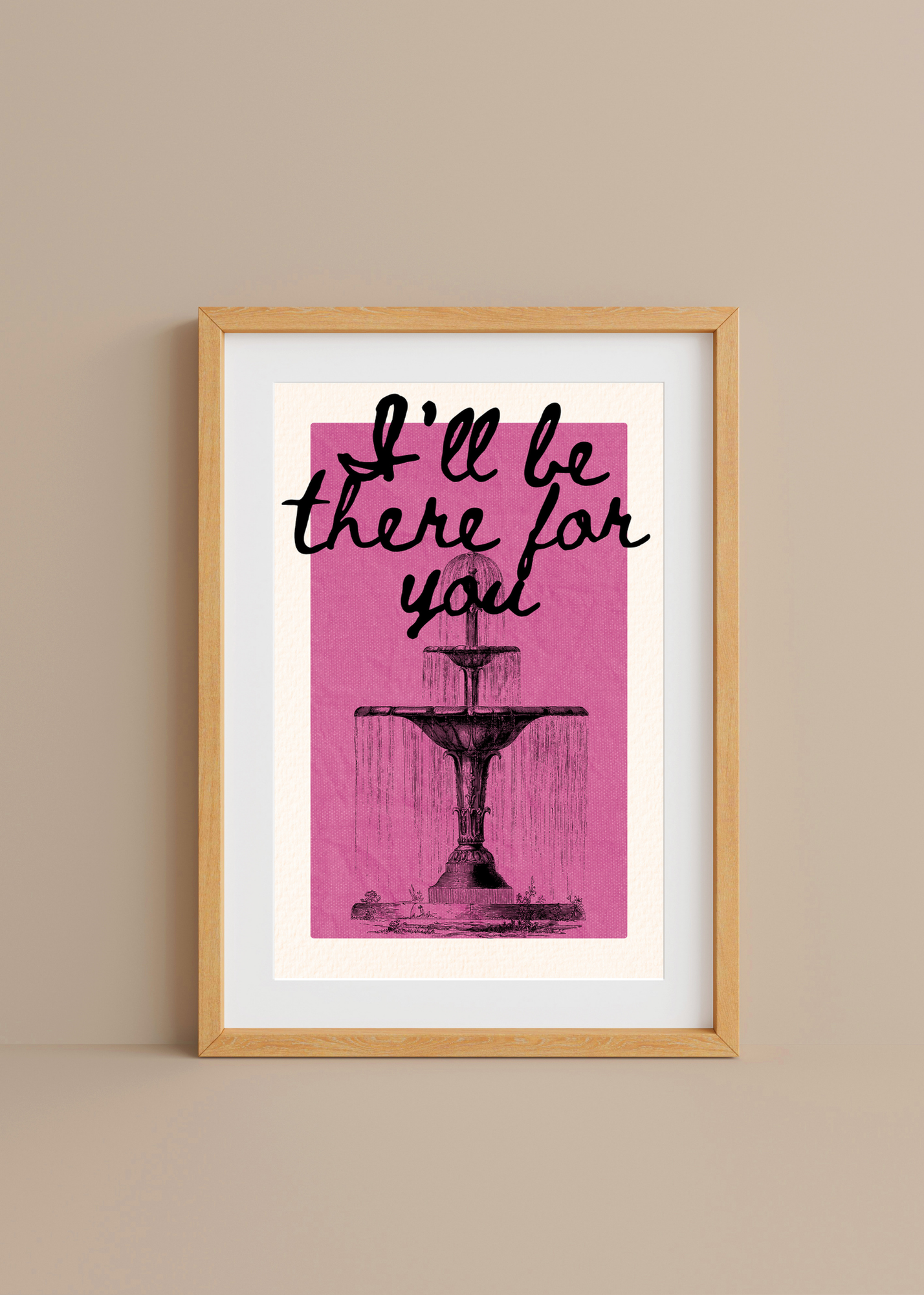 I'll Be There for You— Framed in white with a bold purple background, this print brings cozy sitcom nostalgia right into your space. In flowing black script across the top: “I’ll be there for you.” Below, a sweet black line-drawing of the iconic fountain nods to Friends and its unforgettable intro. It’s joyful, loyal, and the perfect pick for fans who still know every word of the theme song by heart.