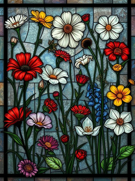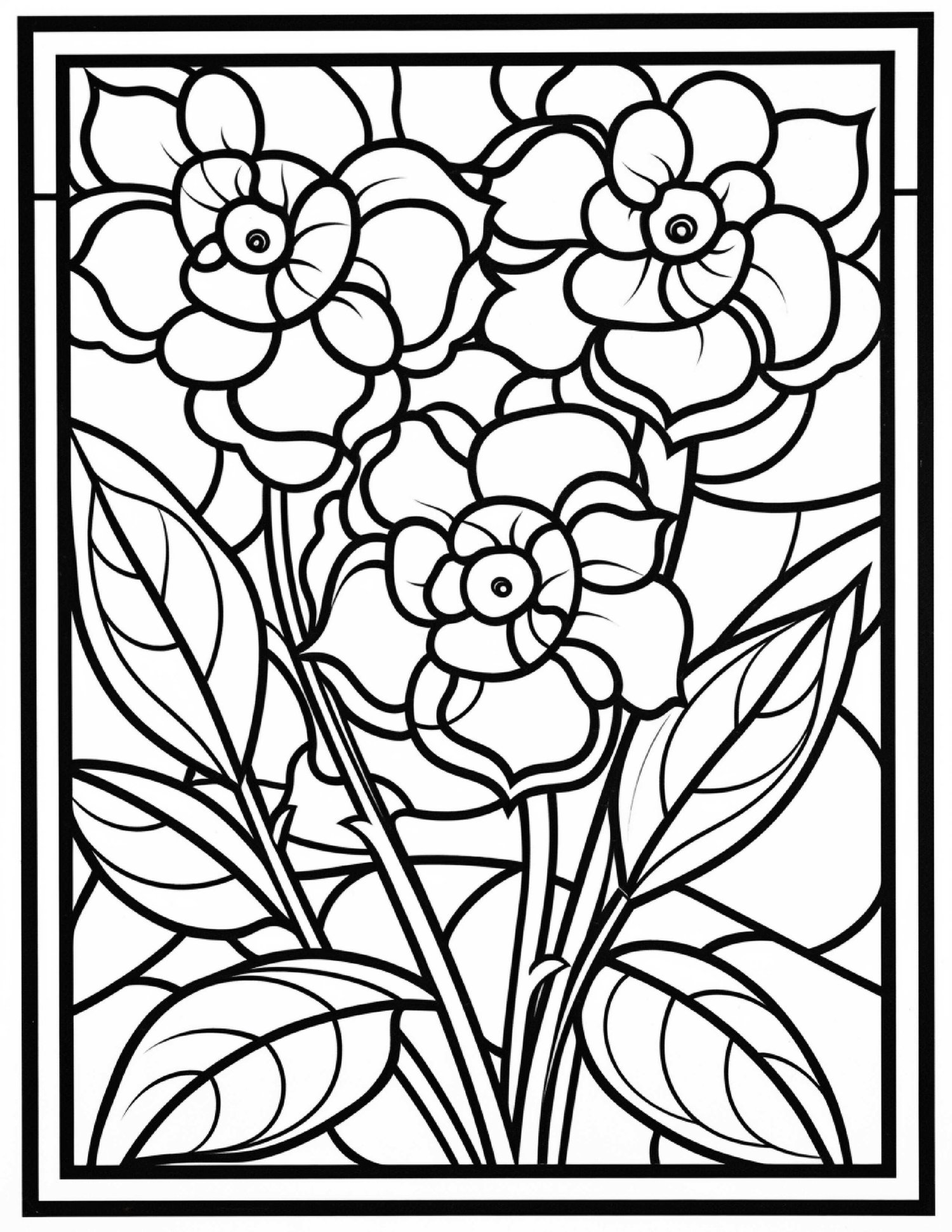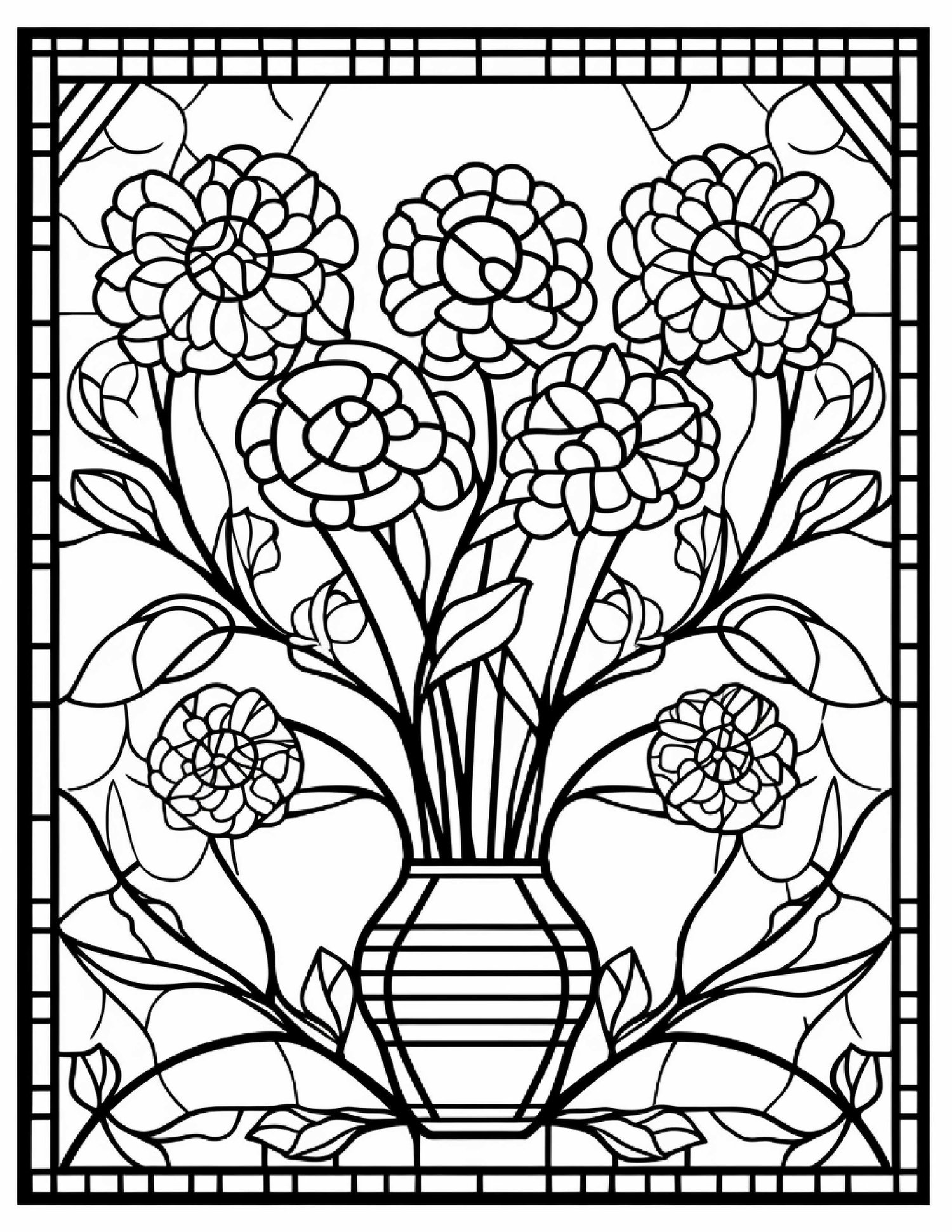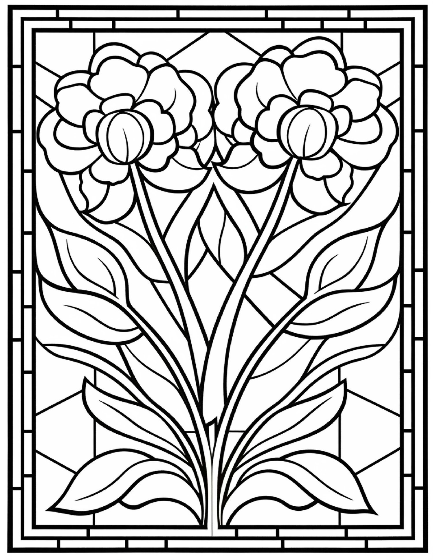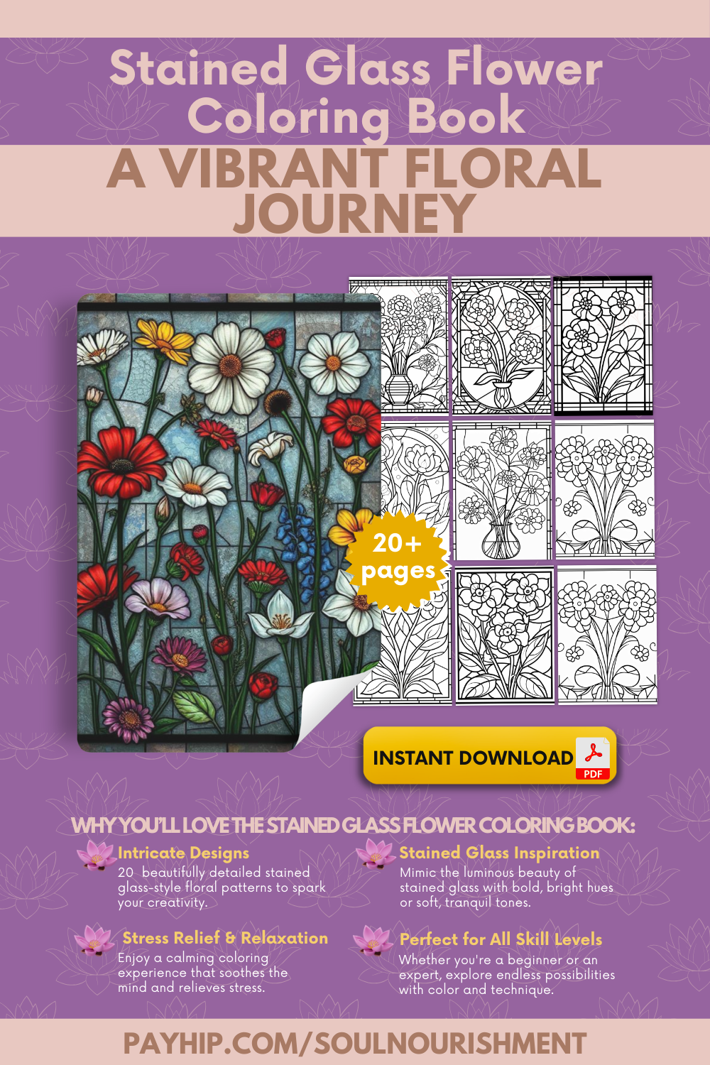 - 20 Stunning Pages: A captivating collection of floral designs, including roses, sunflowers, lilies, tulips, and exotic blooms, all arranged in intricate patterns mimicking stained glass artistry.