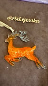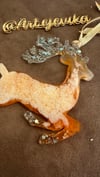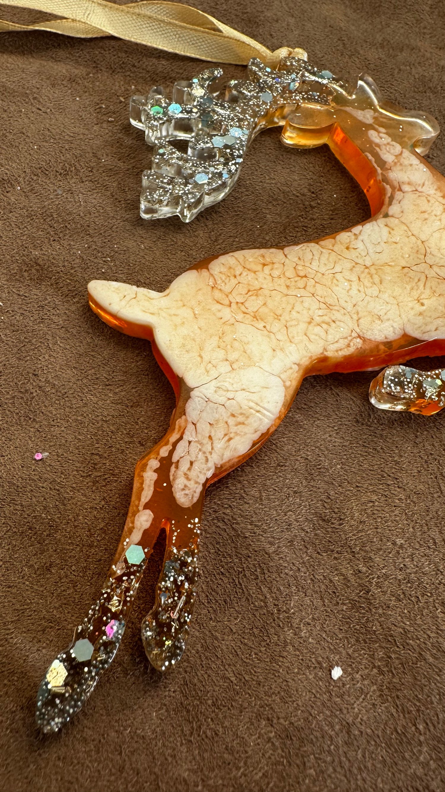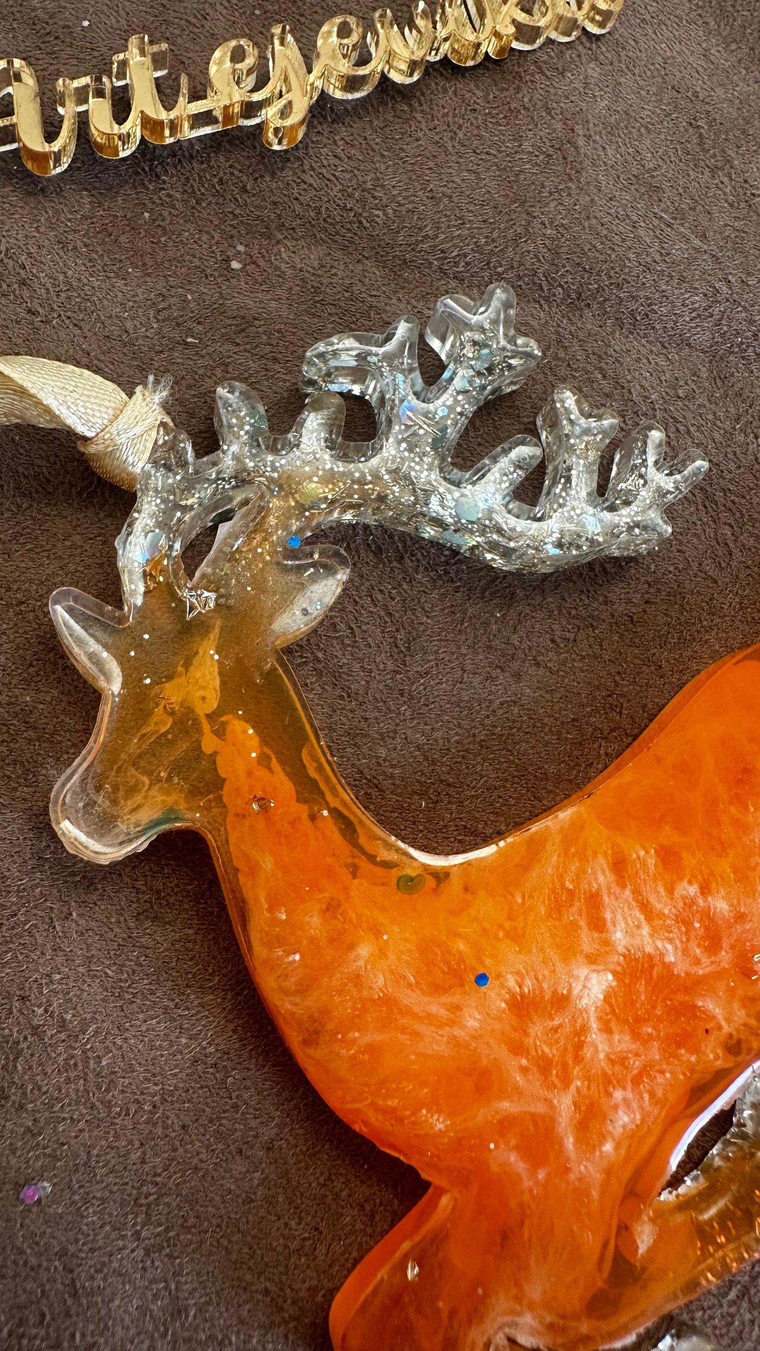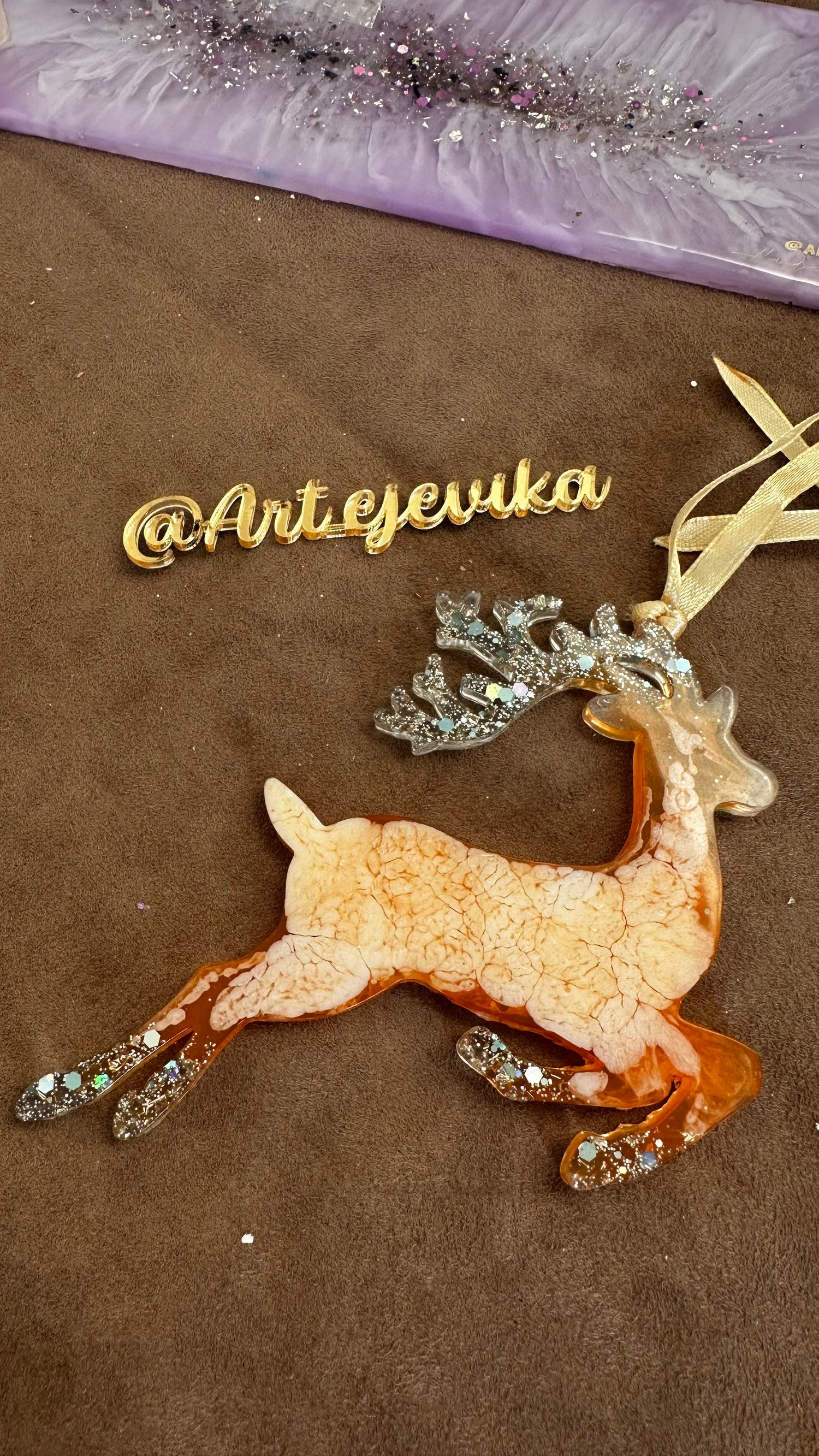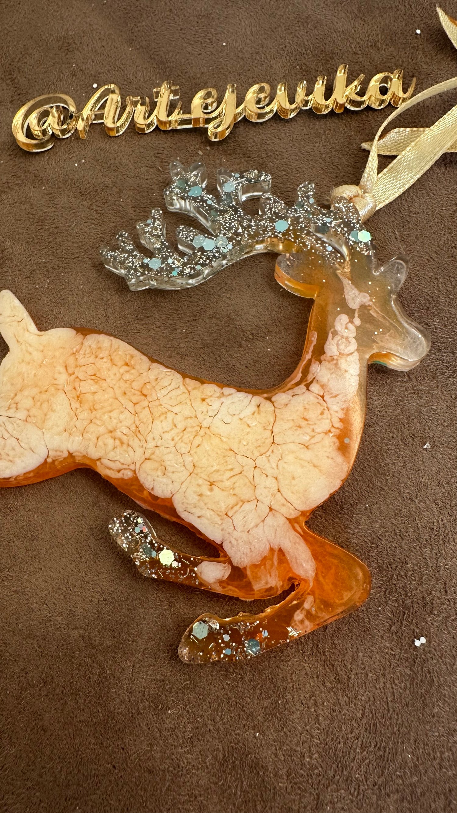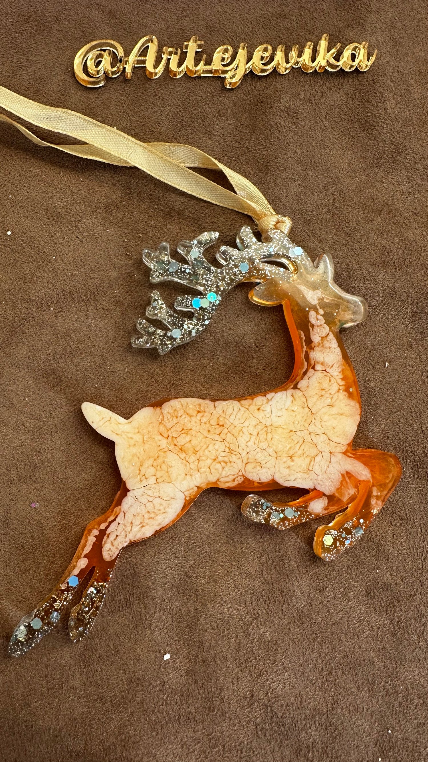 This handmade ornament will be a true highlight of your Christmas tree. It combines the warmth of a sunny hue with elegant sparkle. The deer’s body is crafted from transparent epoxy resin with soft golden-orange patterns, creating a cozy and luminous feel. The antlers, adorned with shimmering crystals and glitter, add sophistication and a festive touch. Each detail of this ornament is unique, emphasizing its exclusivity.