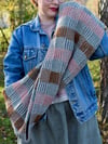 The cowl and scarf have the same construction: both are knit flat in two-color Brioche and Garter stitch. The cowl is created by seaming the short sides of the scarf (cast-on and bind-off edges) together after blocking.