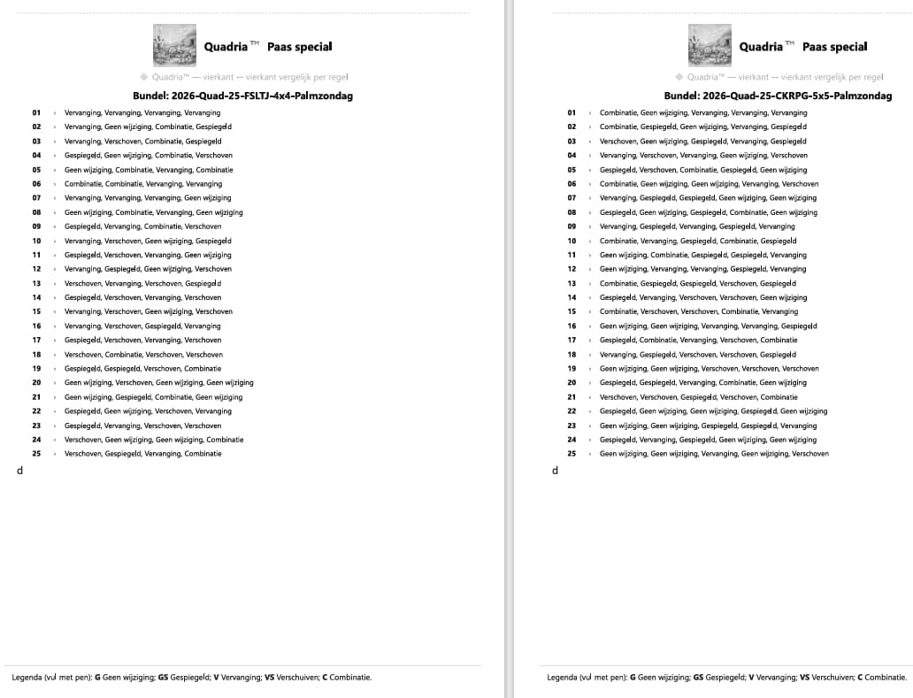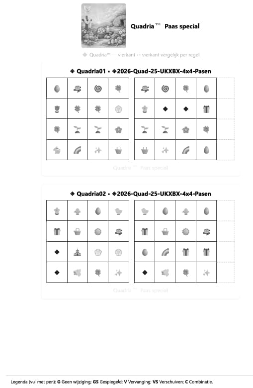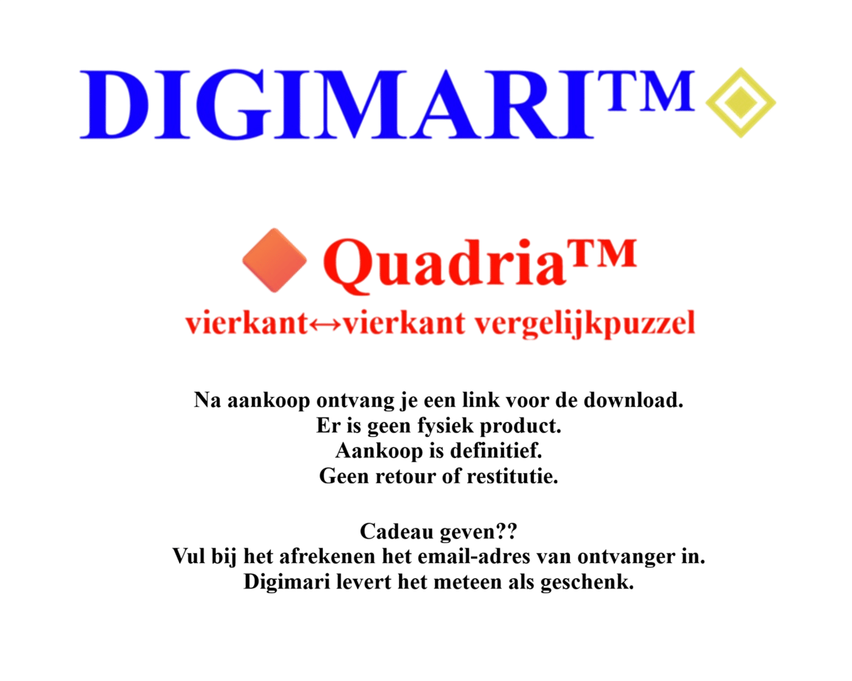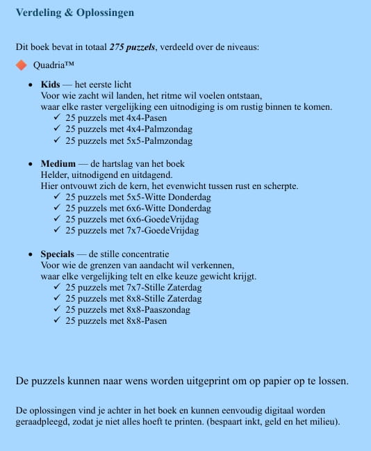 De Quadria™ Paas Special is een uitgebreide digitale puzzelbundel met maar liefst 275 unieke vergelijkpuzzels, zorgvuldig samengesteld door de Digimari Taal- & Puzzelclub. Deze editie is ontworpen voor wie rust, logica en ritme zoekt tijdens de Paasdagen. Zoals het voorwoord zo mooi zegt: “Puzzelen is een vorm van stilte.”