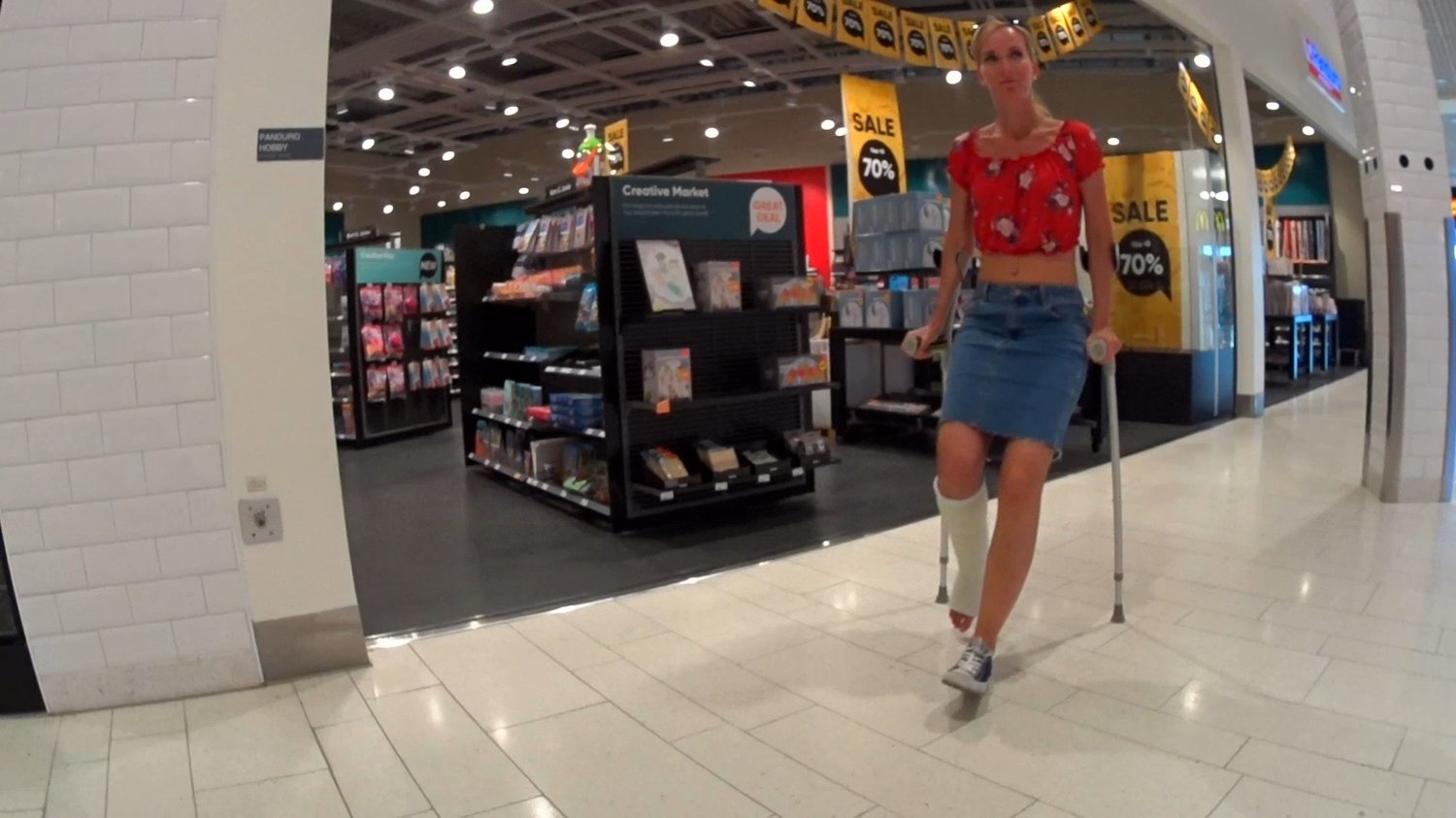 Stefanie is today crutching in to a Mall.She still has her white term SLC on and we follow her when she crutch in to a store there she first look at some furniture but then sits down and tries on morning slippers which she decides to buy.Another great crutching clip with Stefanie