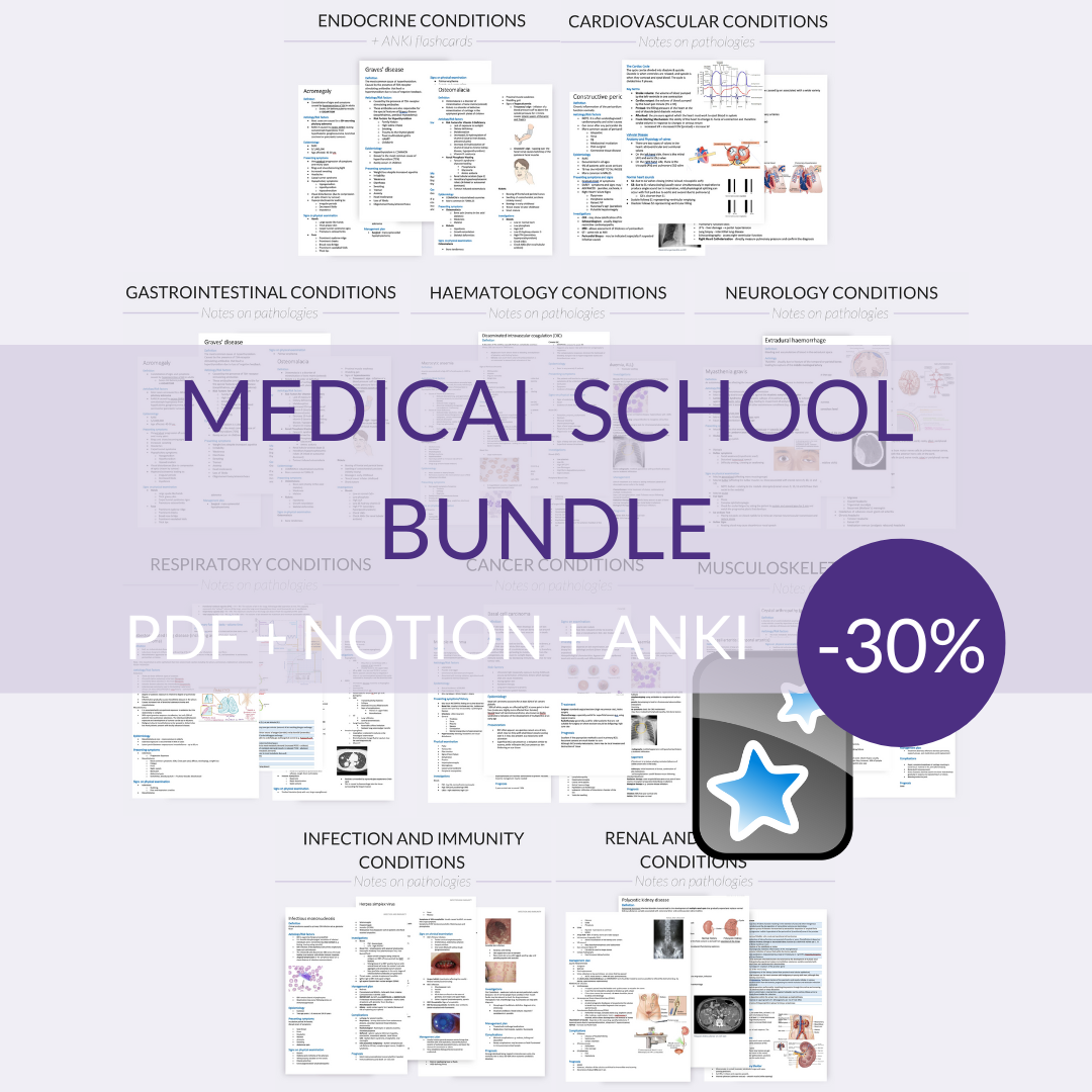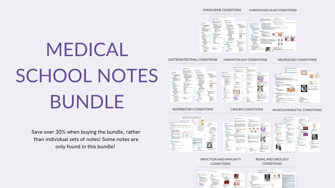This digital download will give you access to ALL of the typed (and handwritten) notes, as well as ANKI flashcards, I made during my third year of medical school. This download has over 500 pages pages and covers the following conditions: