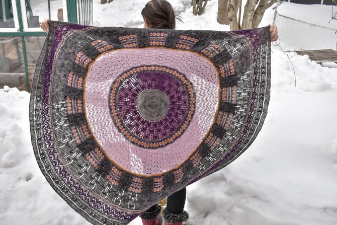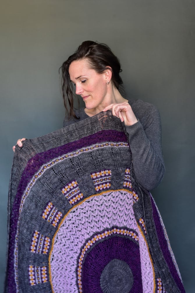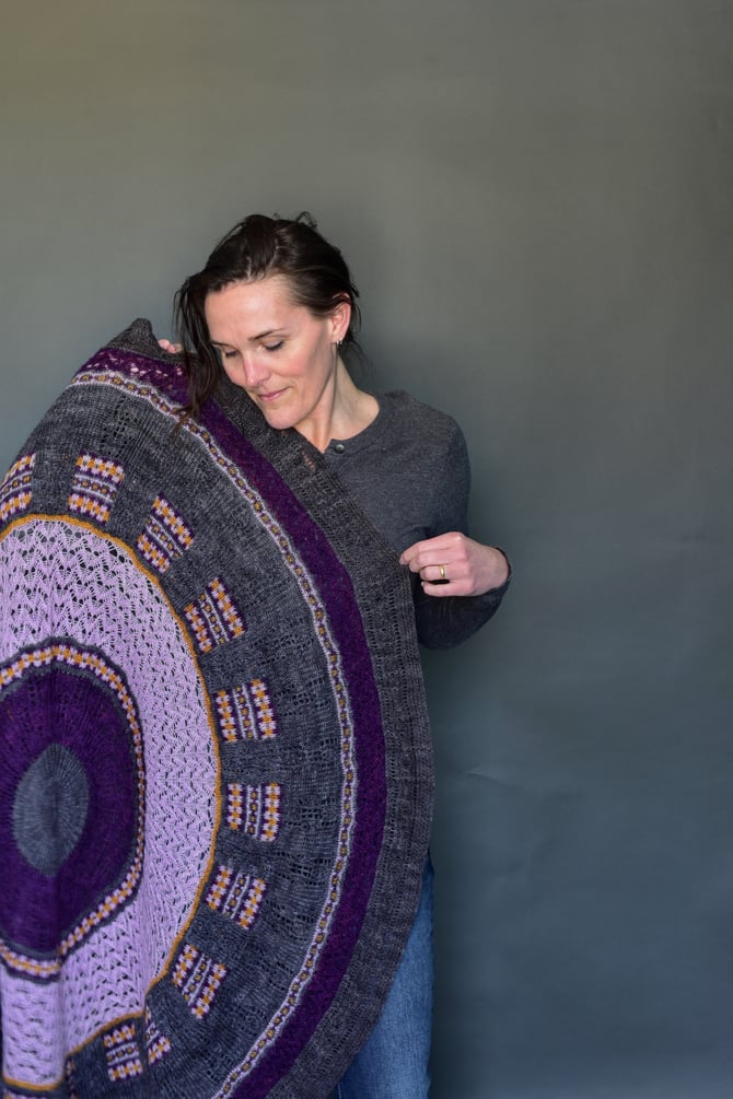 Carbonear is a circular hap, alternating between Fair Isle bands and lace. Lace flaps are created that overlap the middle Fair Isle band. After the band is complete the flaps are rejoined and the lace patterning continued. The flaps give a spoke-like appearance, and along with the name of Carbonear, I’m reminded of atomic structures and envision lace bands bonding over the Fair Isle.