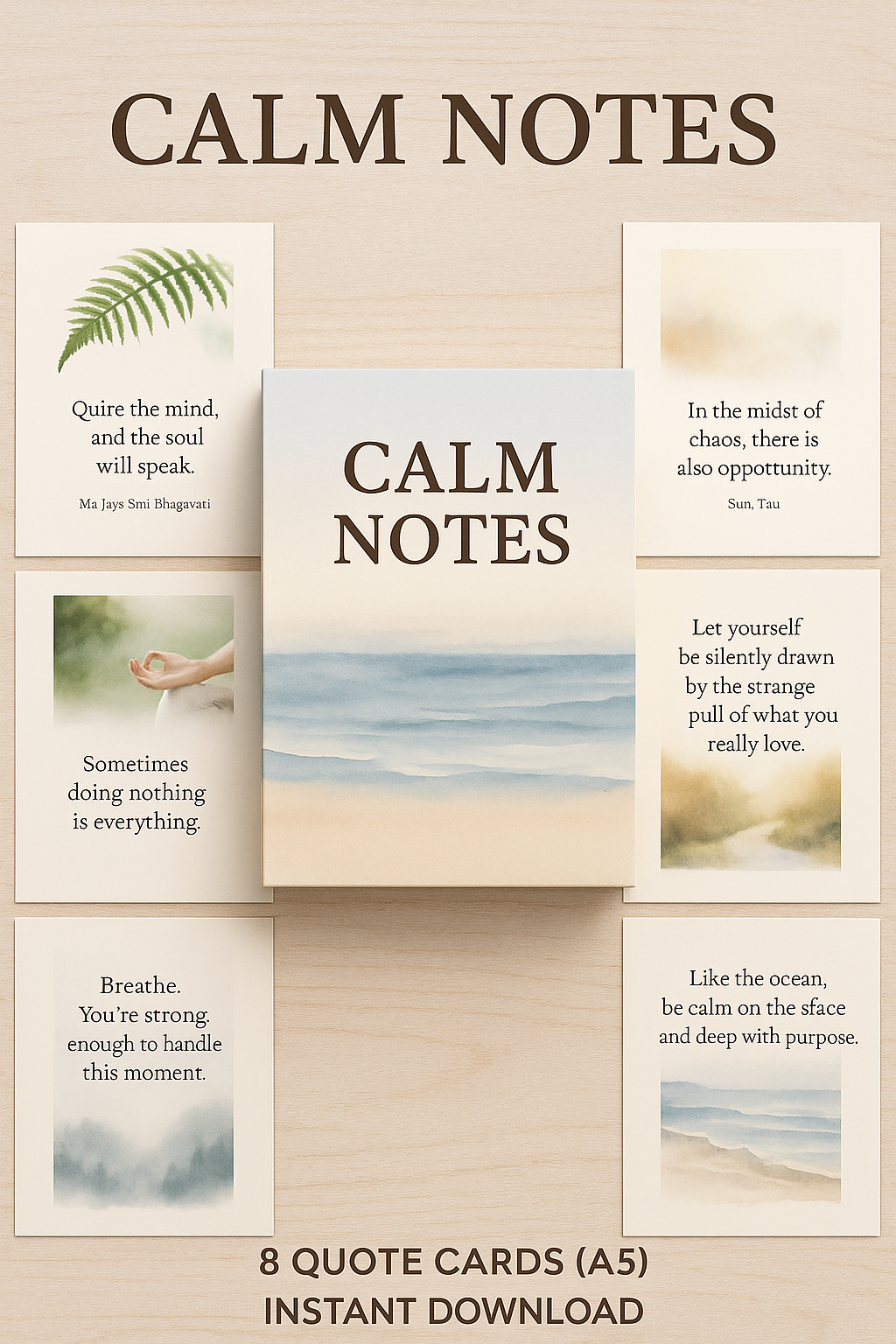 Calm Notes is a printable collection of gentle quote cards designed to bring stillness, peace, and clarity to your day. Each card blends calming affirmations with soothing, nature-inspired imagery โ perfect for moments of overwhelm, mindfulness spaces, or thoughtful gifting.