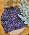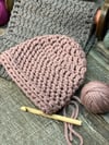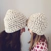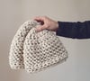 This pattern is worked from the top down and can be made in 3 sizes: S (child), M, & L. It uses a 12mm crochet hook and any super bulky yarn. This pattern works best if the yarn is a 5 WPI.