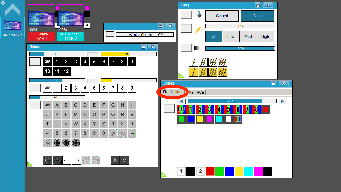 * En el modo CH14 verifique, con un Fixture de pruebas (click), que coincidan estos canales: 1 Dimmer, 11 Rojo, 14 Blanco, 2 Strobo del Rojo, 8 Strobo del Blanco.