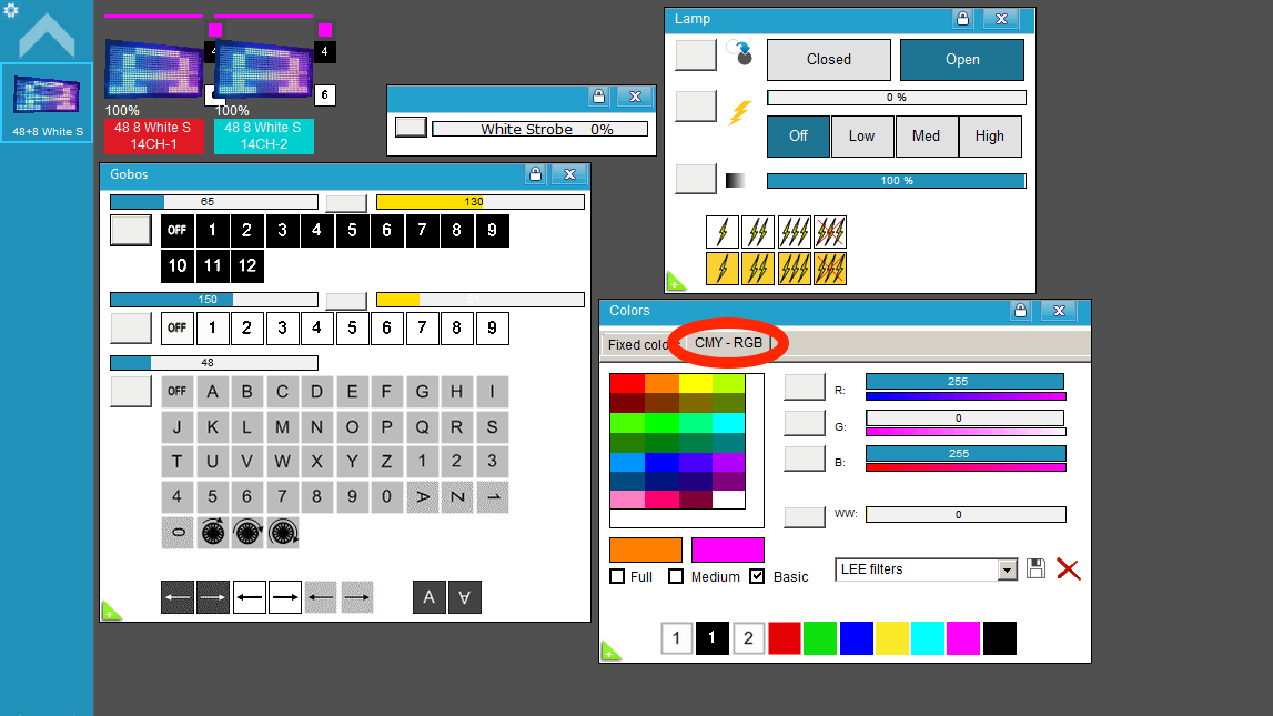 • Mezcla de Colores RGBW (Pestaña “CMY-RGB”).