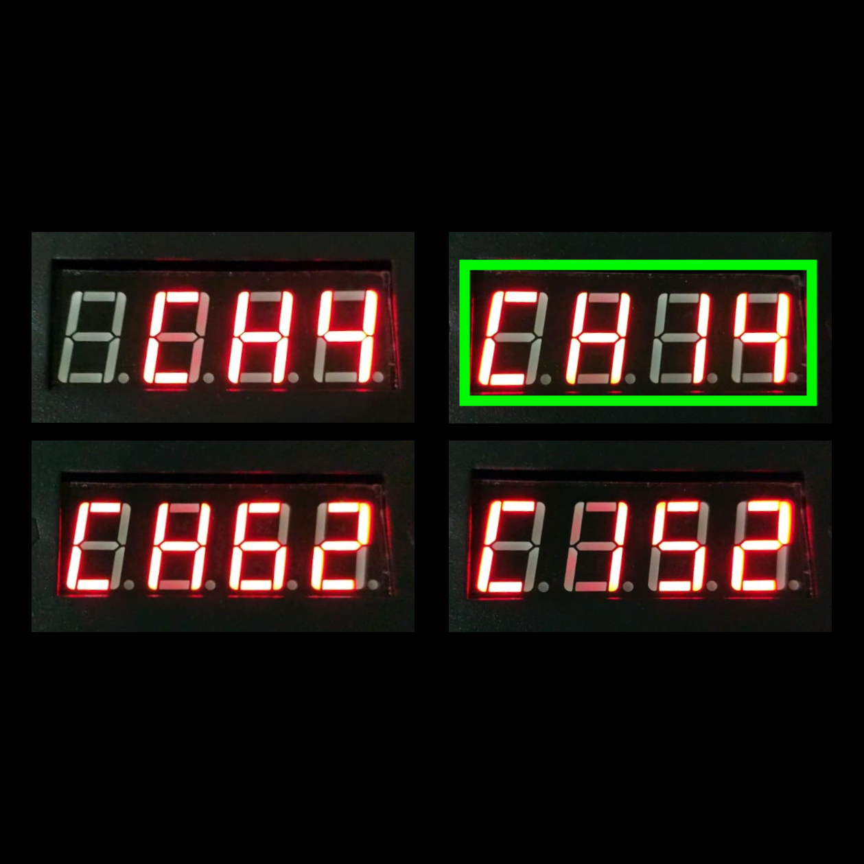 * Verifique, en el display del equipo, que muestre los modos dmx: CH4, CH14, CH62 y C152 (ver cuarta foto).